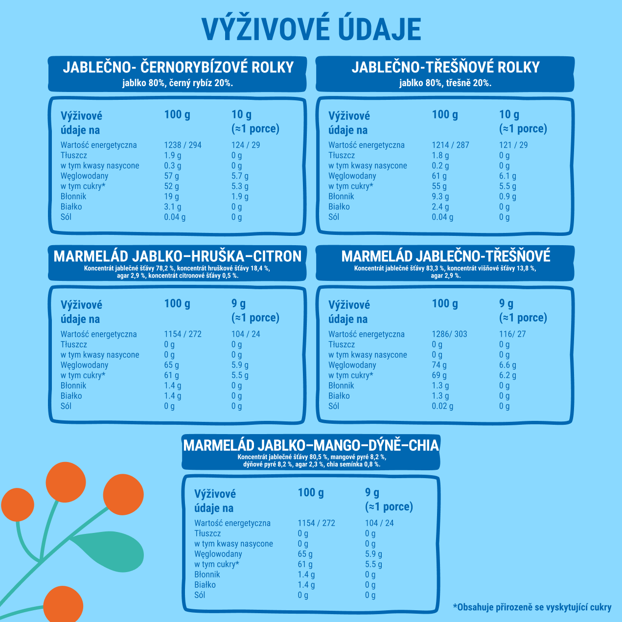 Moje produkty jsou vyrobené 100% pouze z ovoce, bez přidaného cukru. Neobsahují nejběžnější alergeny: arašídy, ořechy, mléko, vejce, sóju, obiloviny obsahující lepek, ryby, měkkýše, nebo sezam. Neobsahují lepek ani umělé přísady. Pouze čisté ovoce a nic víc!