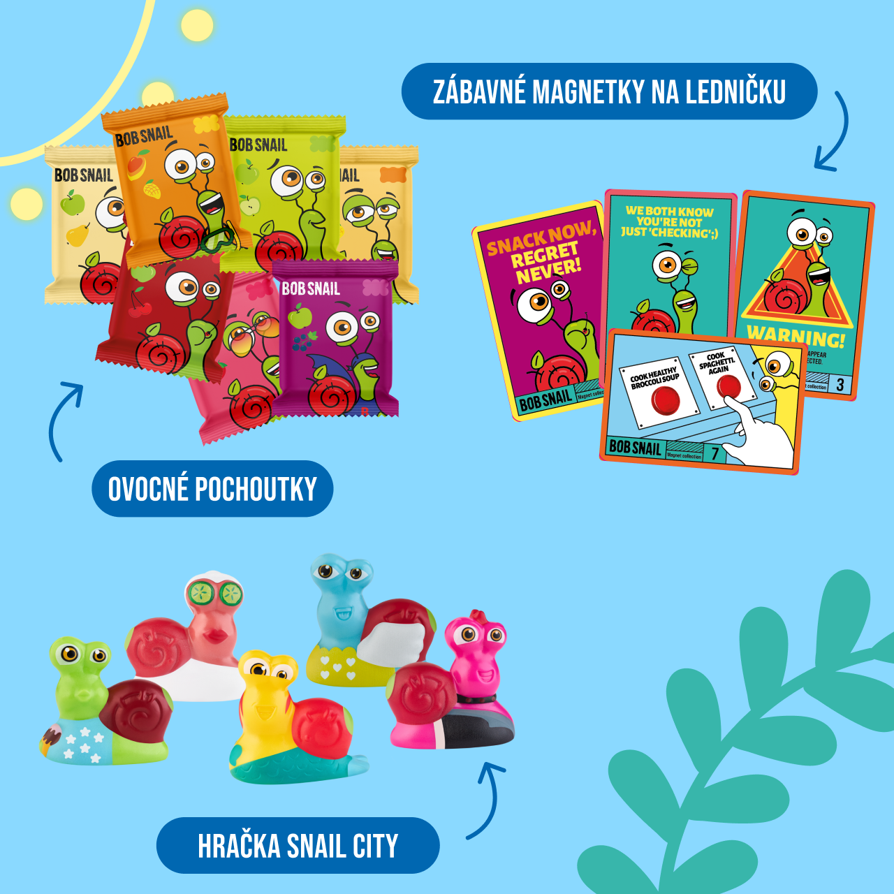 Adventní kalendář ukrývá 24 okének s překvapením. Uvnitř najdete celou sbírku hraček Snail City, ovocné dobroty bez přidaného cukru a magnetky na lednici.