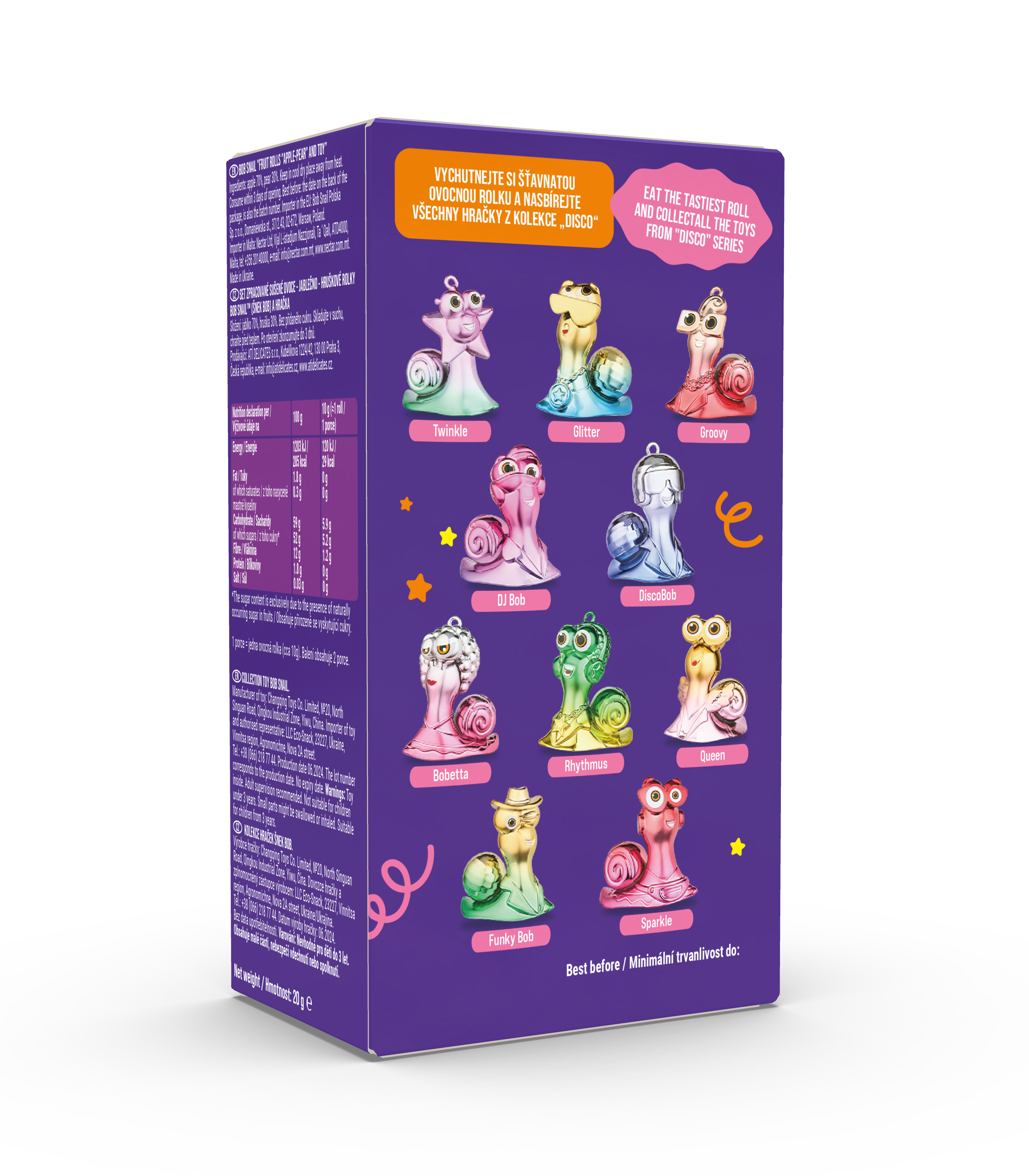 Sady Eat & Play s hračkami Disco jsou perfektním dárkem pro vaše nejmenší při jakékoliv příležitosti. Uvnitř každé krabičky čeká jedna z 10 unikátních hraček ze sběratelské kolekce Disco, dvě zdravé ovocné rolky a také kartičku sběratele s obrázky postaviček z celé kolekce.