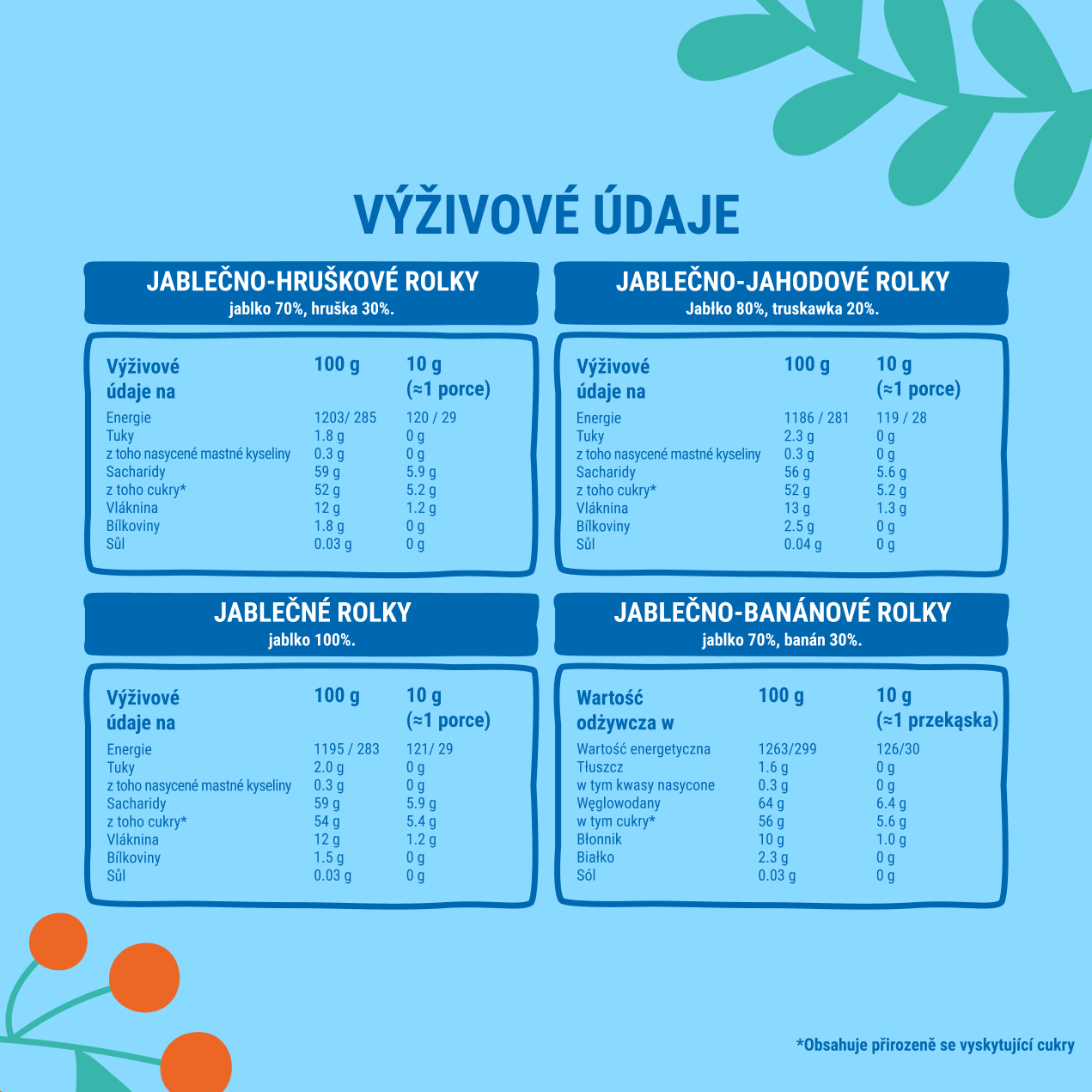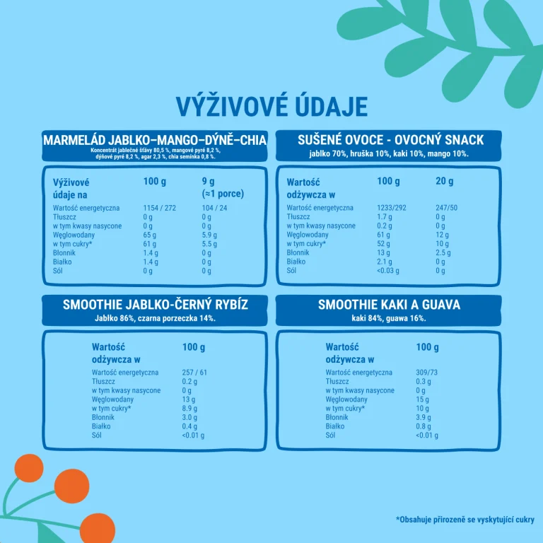 – ovocné dobroty bez přidaného cukru – rolky, smoothie, ovocné snacky i želé