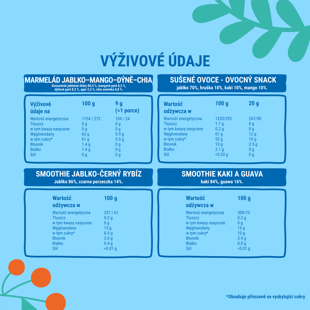 Moje produkty jsou vyrobené 100% pouze z ovoce, bez přidaného cukru. Neobsahují nejběžnější alergeny: arašídy, ořechy, mléko, vejce, sóju, obiloviny obsahující lepek, ryby, měkkýše, nebo sezam. Neobsahují lepek ani umělé přísady. Pouze čisté ovoce a nic víc!