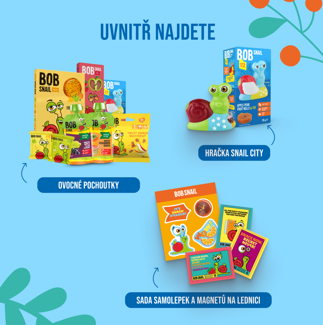 Snail City je kolekce 6 kovových domečků. Uvnitř najdete ovocné dobroty, sadu Eat&Play se sběratelskou figurkou z kolekce Snail City, 3D samolepky a magnetky na lednici.