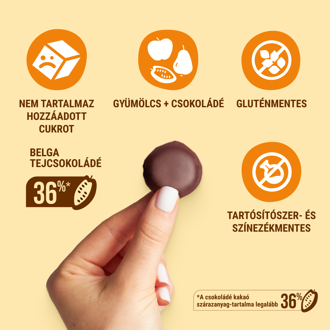 Bűntudatmentes gyümölcs édesség belga csokoládéval bevonva – nincs benne hozzáadott cukor, tartósítószer vagy glutén. Gazdag gyümölcsíz, élénk csokis jegyekkel.