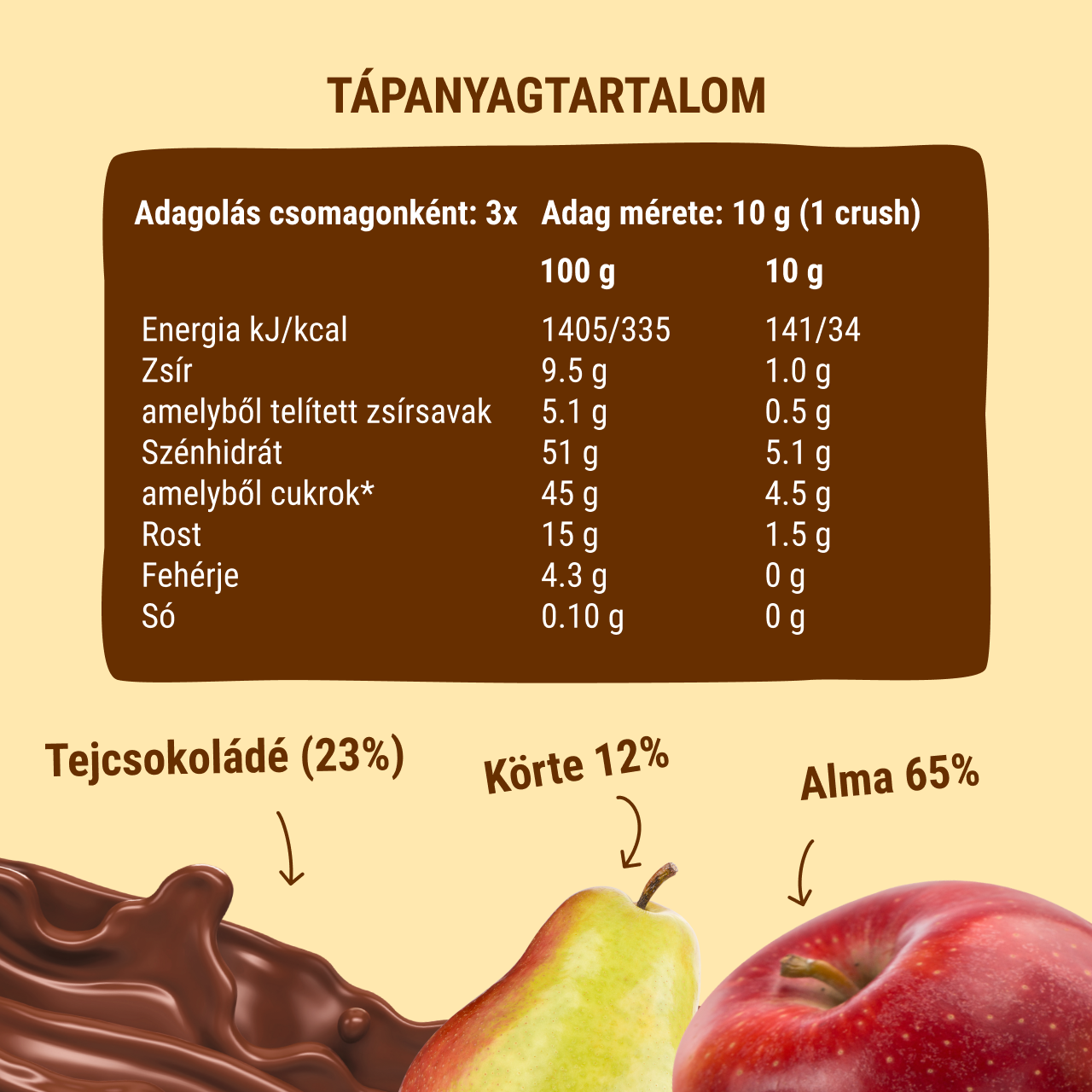 Gyümölcstöltelék (77%): alma 65%, körte 12%; tejcsokoládé (23%): rost (oligofruktóz), kakaóvaj, zsíros TEJPOR, zsírszegény TEJPOR, kakómassza, emulgeálószer: napraforgó lecitin, természetes vanília aroma, édesítőszer: stevia kivonat. *Kakaó szárazanyag tartalom az étcsokoládéban minimum 36%. Az allergén összetevők aláhúzva.