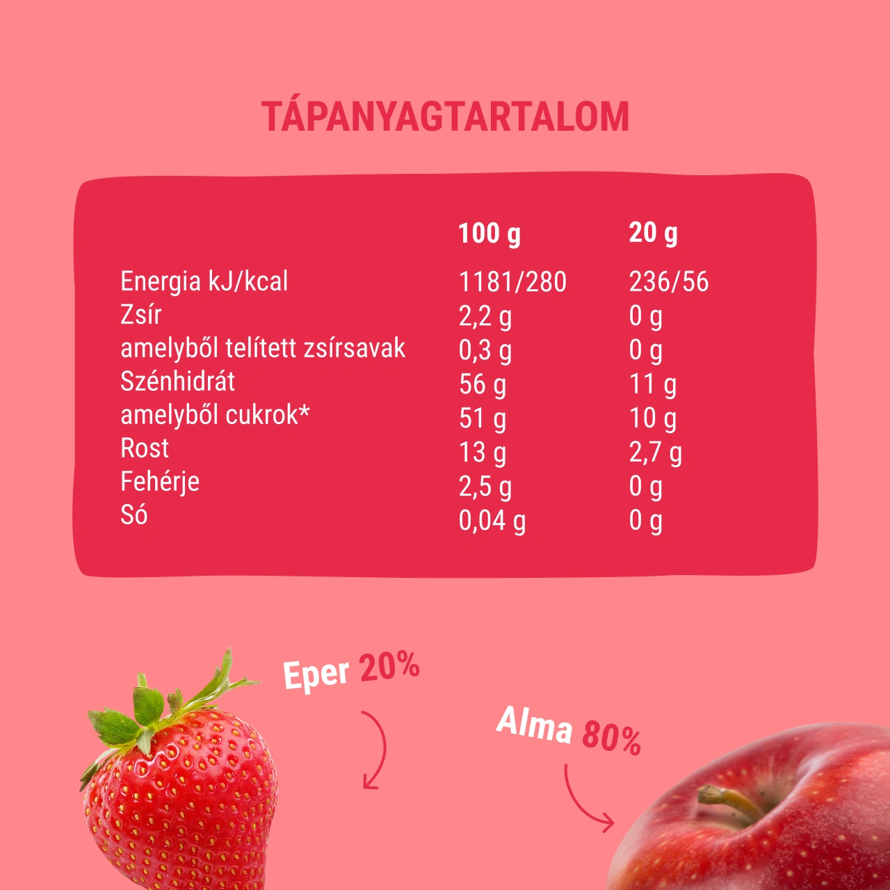 Csak gyümölcsből készült, hozzáadott cukor és mesterséges adalékok nélkül. Allergénmentes, vidám gyümölcs- és kis csigaformákkal – tökéletes nassolnivaló minden korosztálynak, bárhol.