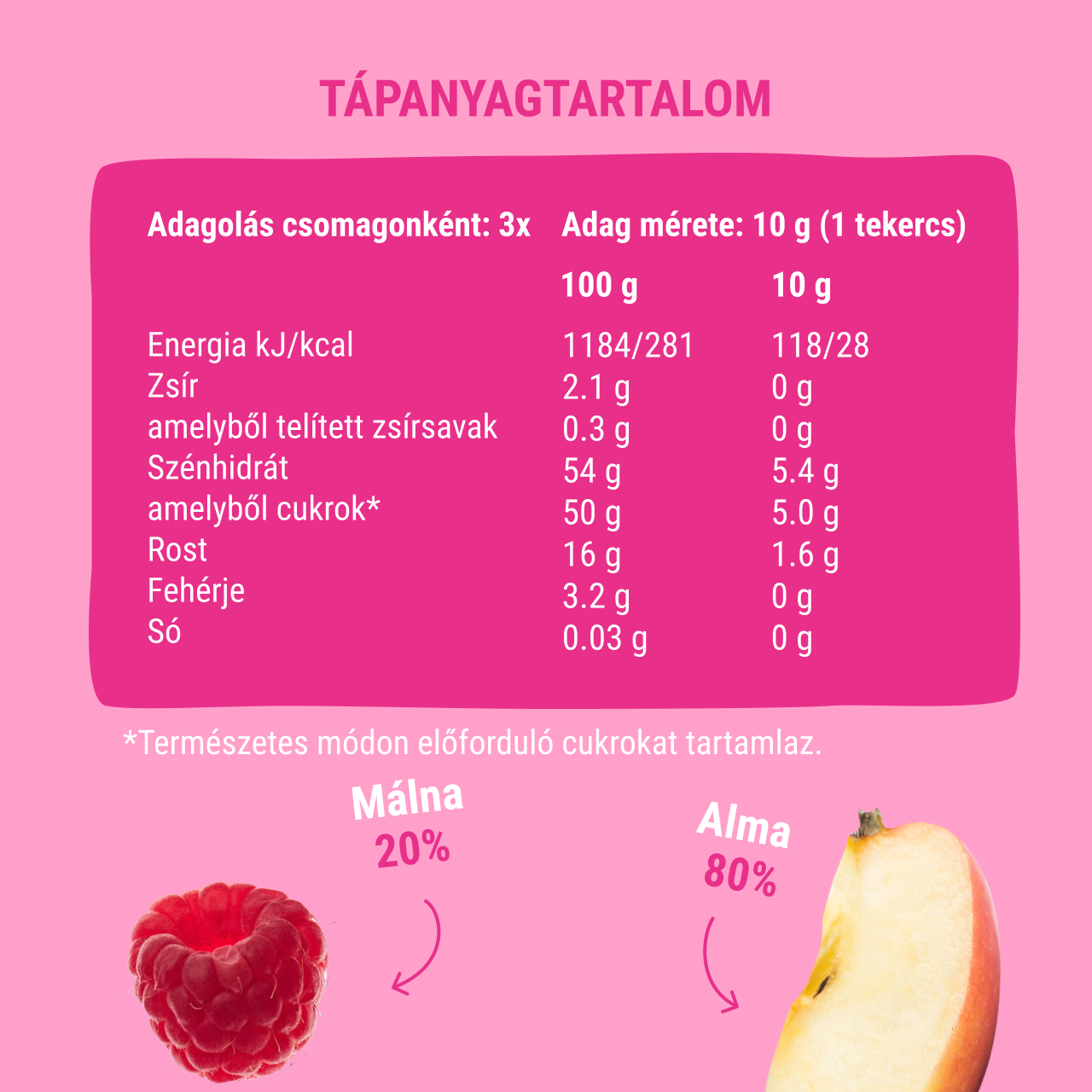 A gyümölcs tekercsek természetes és tápláló finomságok valódi gyümölcsből – nem tartalmaznak hozzáadott cukrot, tartósítószert, mesterséges színezéket vagy aromát. Gyerekeknek és felnőtteknek is egészséges nassolnivaló – iskolában, munkában vagy útközben.