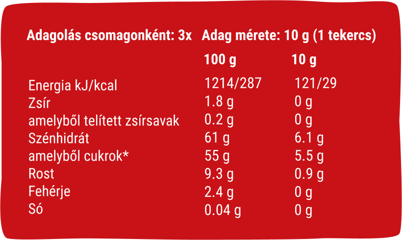 Könnyen magaddal viheted – pont beleillik az uzsonnásdobozba, sporttáskába, kocsiba vagy hátizsákba. És a fogyasztásuk igazi móka! Tépj belőle, harapj bele, vagy tekerd ki lassan, hogy tovább tartson a gyümölcsös élvezet! |