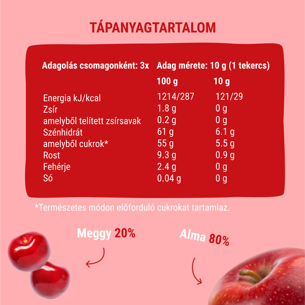 A gyümölcs tekercsek természetes és tápláló finomságok valódi gyümölcsből – nem tartalmaznak hozzáadott cukrot, tartósítószert, mesterséges színezéket vagy aromát. Gyerekeknek és felnőtteknek is egészséges nassolnivaló – iskolában, munkában vagy útközben.