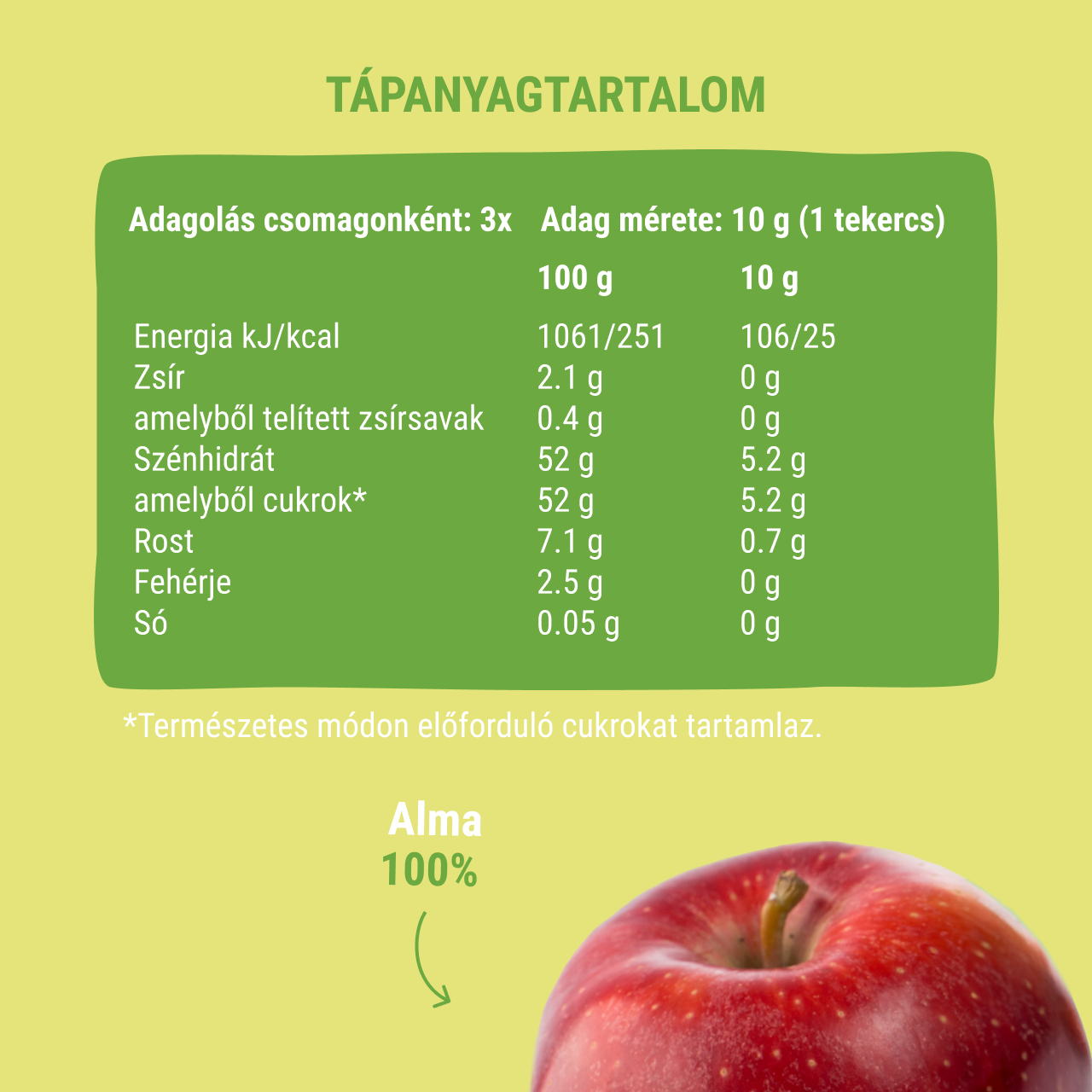 A gyümölcs tekercsek természetes és tápláló finomságok valódi gyümölcsből – nem tartalmaznak hozzáadott cukrot, tartósítószert, mesterséges színezéket vagy aromát. Gyerekeknek és felnőtteknek is egészséges nassolnivaló – iskolában, munkában vagy útközben.