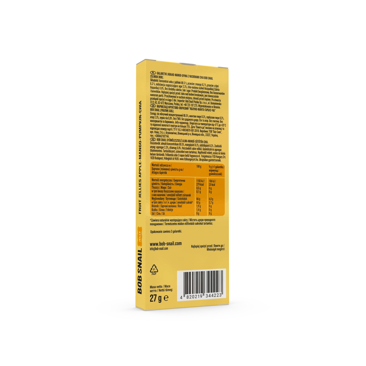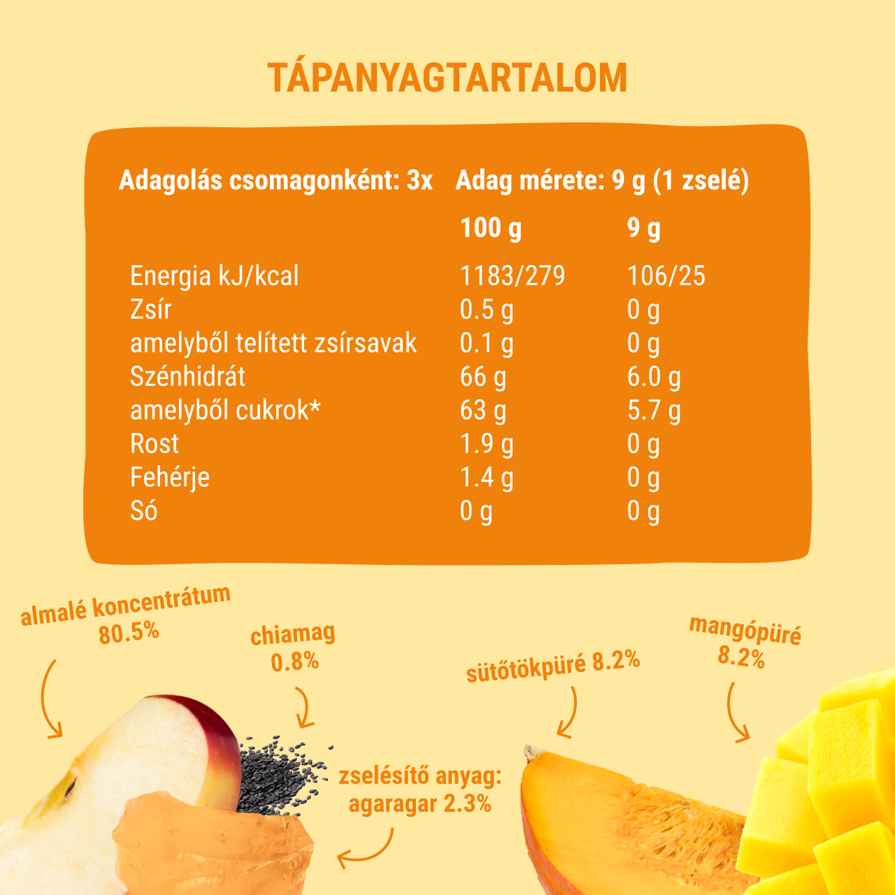 Almalé koncentrátum 80.5%, mangópüré 8.2%, sütőtökpüré 8.2%. Zselésítő