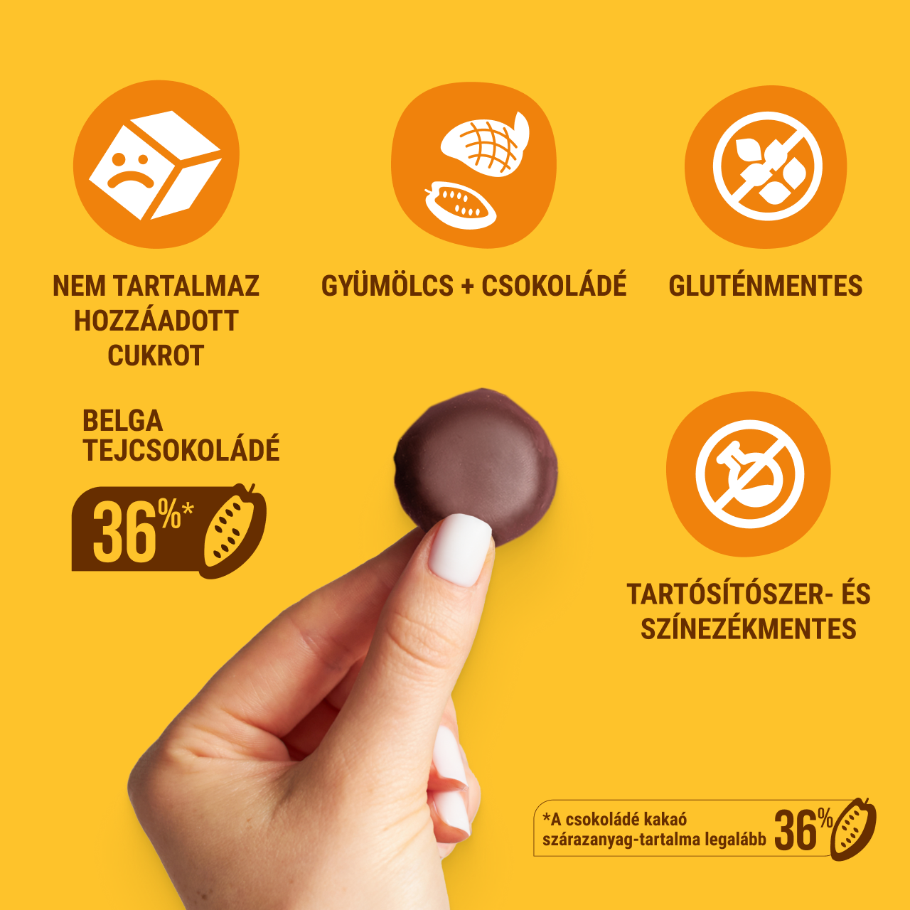 Bűntudatmentes gyümölcs édesség belga csokoládéval bevonva – nincs benne hozzáadott cukor, tartósítószer vagy glutén. Gazdag gyümölcsíz, élénk csokis jegyekkel.