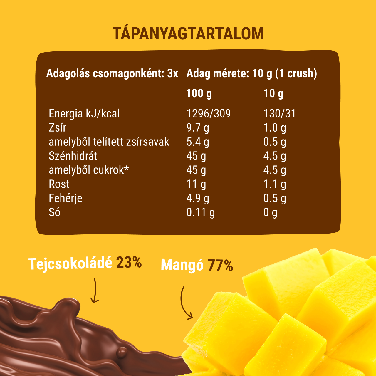 Gyümölcstöltelék (77%): mangó 77%; tejcsokoládé (23%): rost (oligofruktóz), kakaóvaj, zsíros TEJPOR, zsírszegény TEJPOR, kakaómassza, emulgeálószer: napraforgó lecitin, természetes vanília aroma, édesítószer: stevia kivonat. *Kakaó szárazanyag tartalom az étcsokoládéban minimum 36%. Az allergén összetevők aláhúzva.