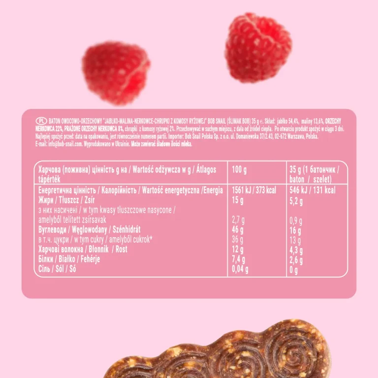 Skład: jabłko 54,4%, maliny 13,6%, ORZECHY NERKOWCA 22%, PRAŻONE ORZECHY NERKOWCA 8%, chrupki z komosy ryżowej 2%.