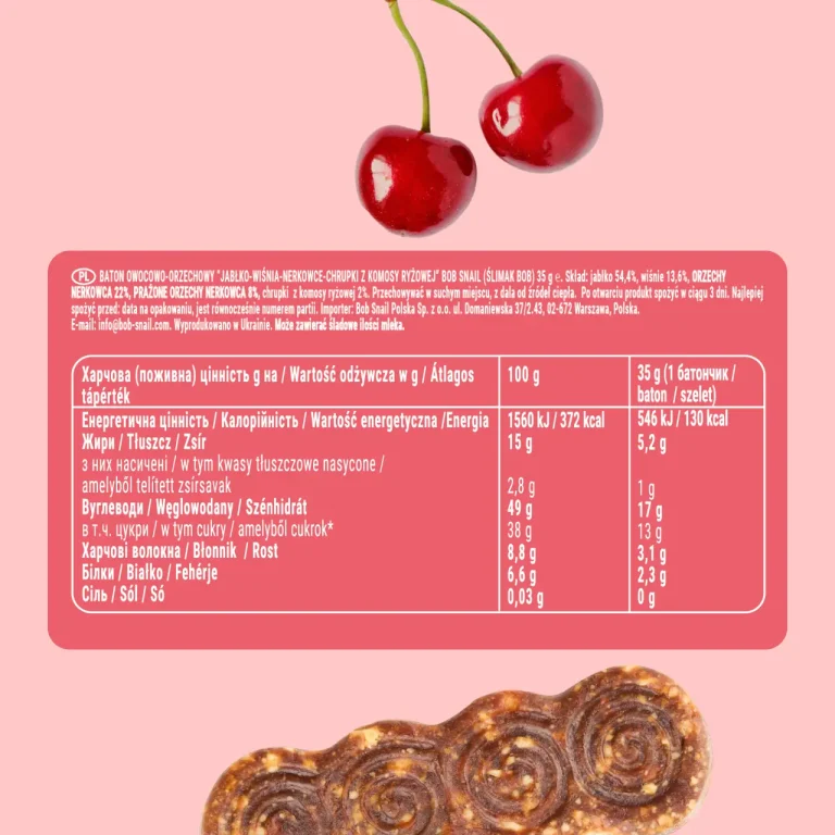 Skład: jabłko 54,4%, wiśnie 13,6%, ORZECHY NERKOWCA 22%, PRAŻONE ORZECHY NERKOWCA 8%, chrupki z komosy ryżowej 2%.