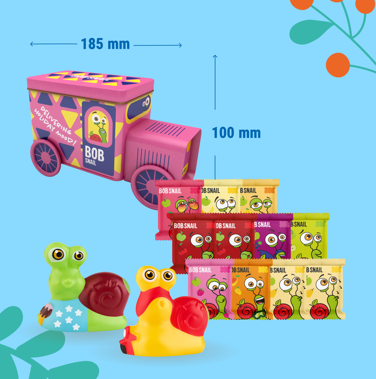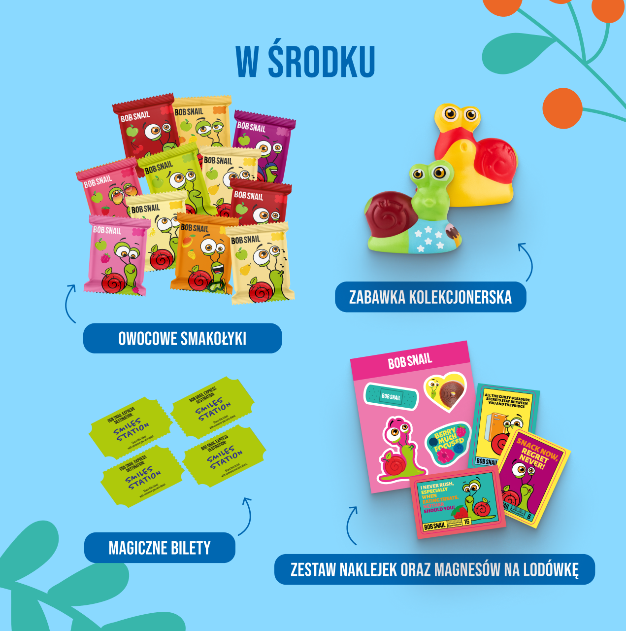 Fruit Start to kolekcja dziewięciu metalowych głównych wagonów wypełnionych smakołykami i niespodziankami. W środku: owocowe smakołyki bez dodatku cukru, kolekcjonerska zabawka Snail City, pakiet naklejek 3D, trzy zabawne magnesy oraz tajemniczy bilet.