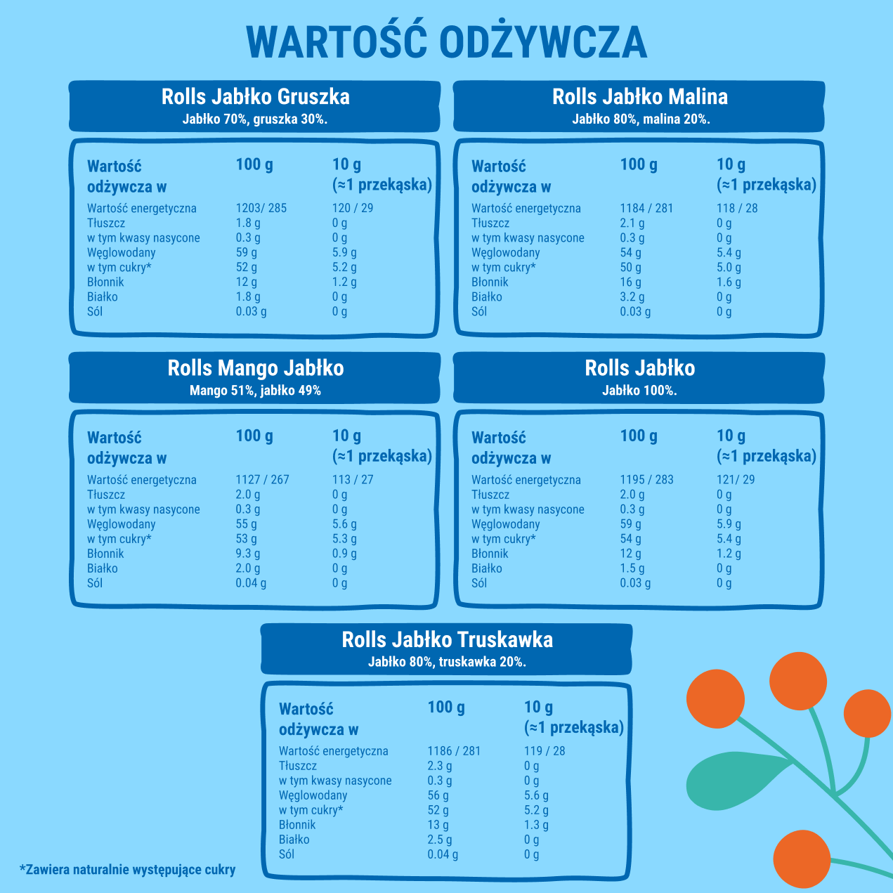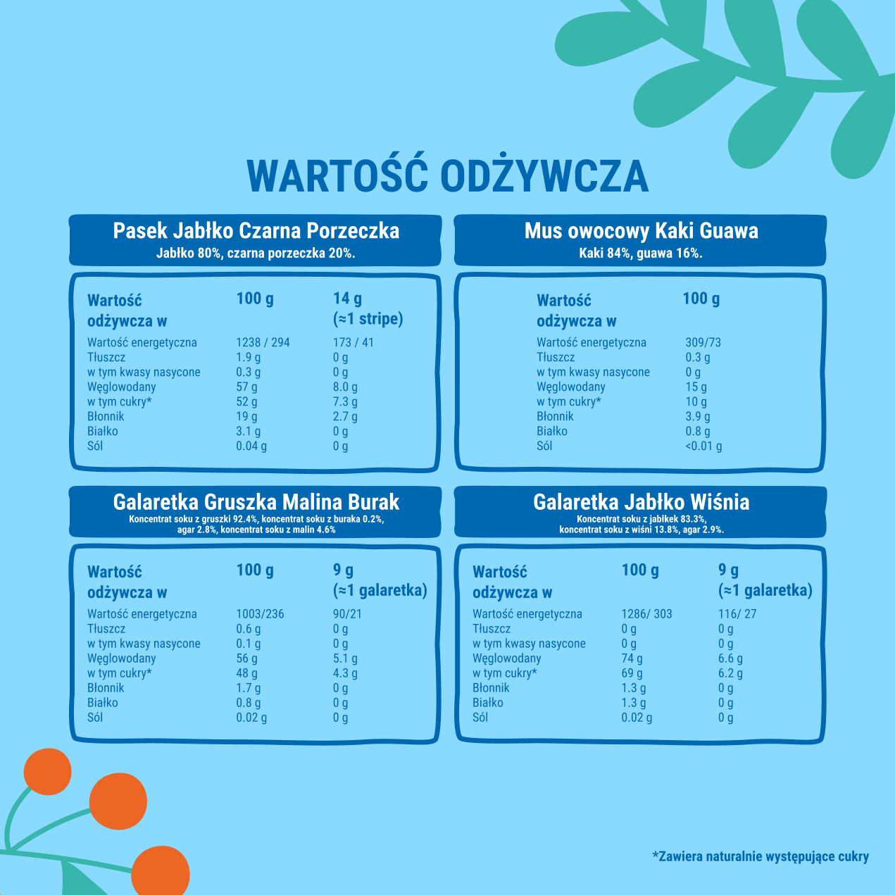 Rollsy, Paski, Galaretki owocowe: Przechowywać w suchym miejscu, chronić przed ciepłem. Po otwarciu przekąski spożyć w ciągu 3 dni.