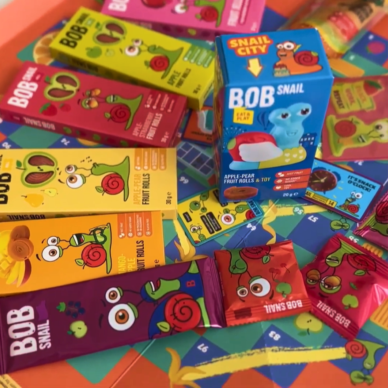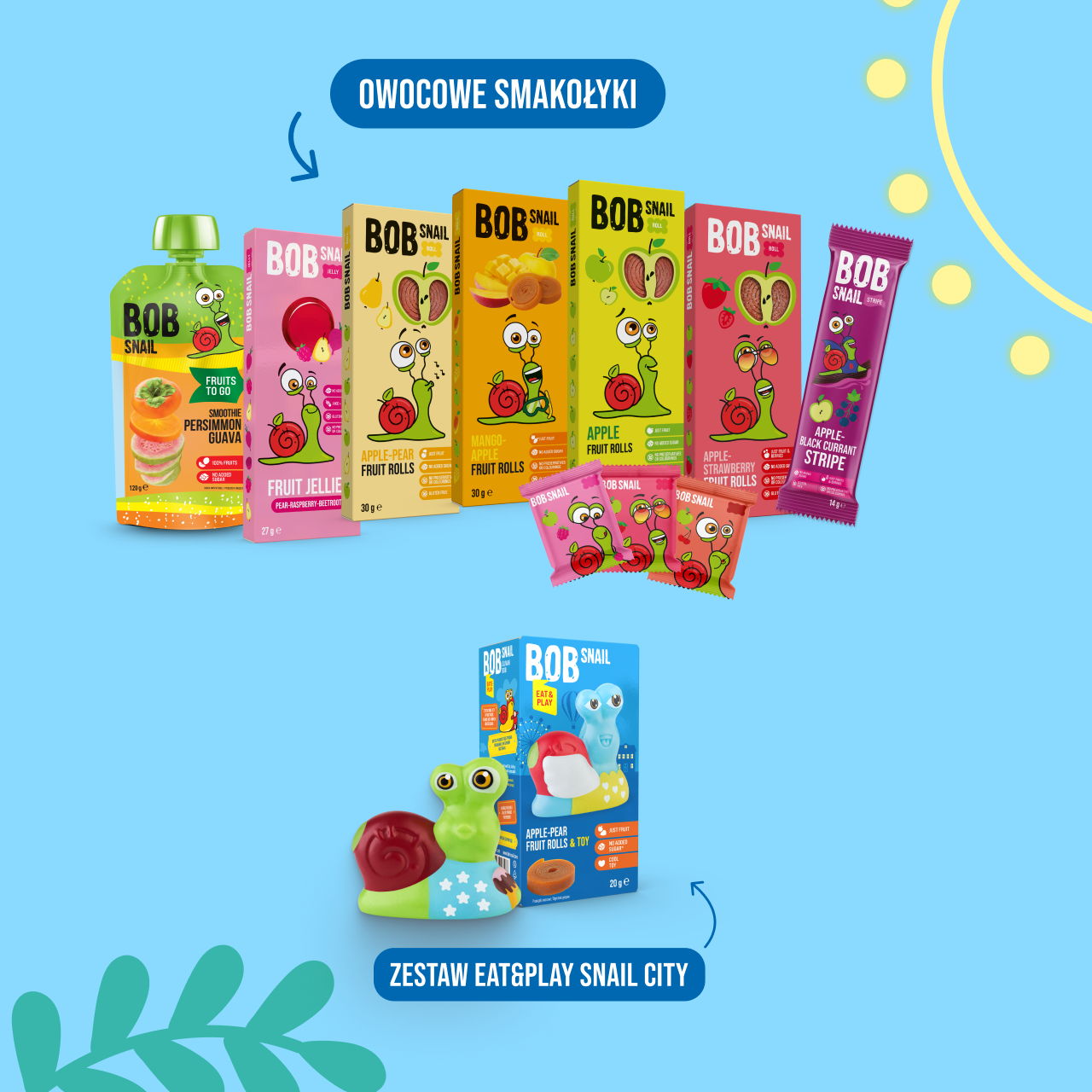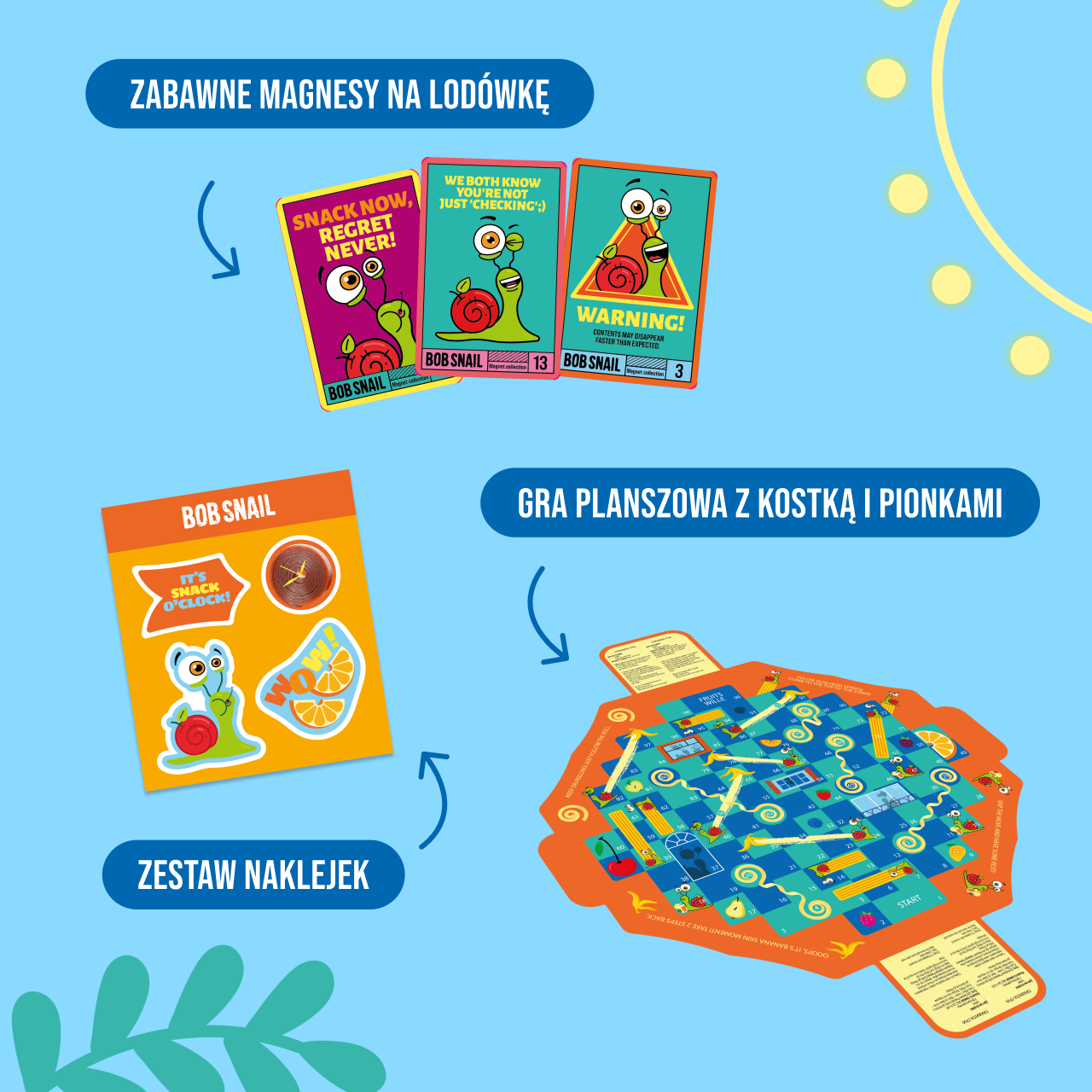 Duży Box Świąteczny to niezawodny prezent na święta. Magiczne pudełko zmienia się w grę planszową i zawiera owocowe smakołyki bez dodatku cukru, zestaw Eat&Play Snail City z kolekcjonerską zabawką, pakiet naklejek 3D oraz zabawne magnesy.
