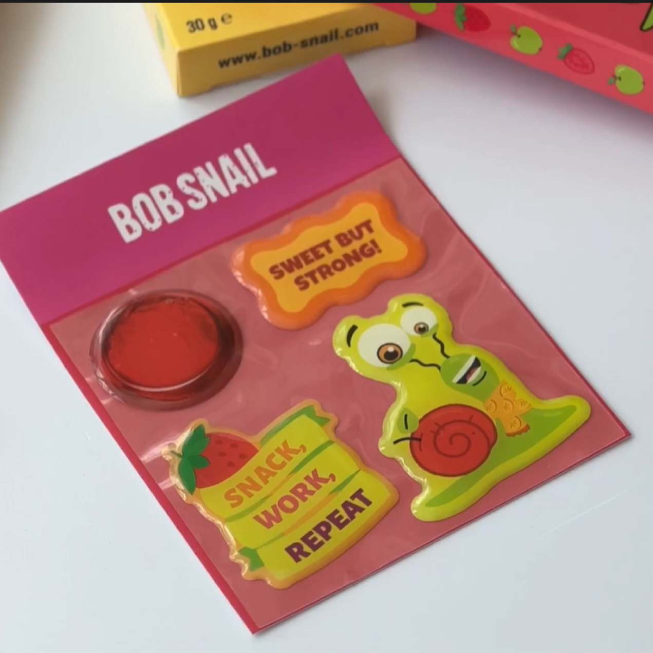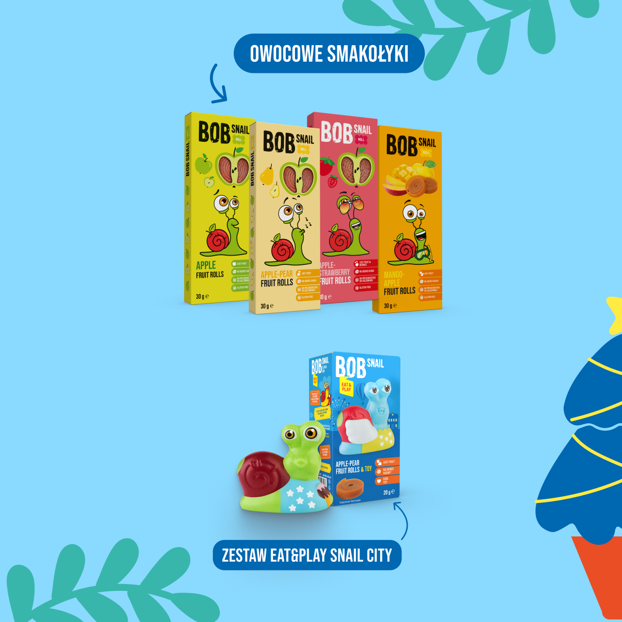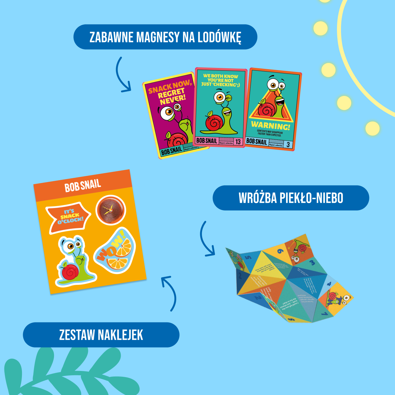 Magiczne pudełko zawiera owocowe rollsy bez dodatku cukru, zestaw Eat&Play Snail City z kolekcjonerską zabawką, pakiet naklejek 3D, trzy zabawne magnesy oraz Wróżbę Piekło–Niebo, która przepowiada przyszłość.