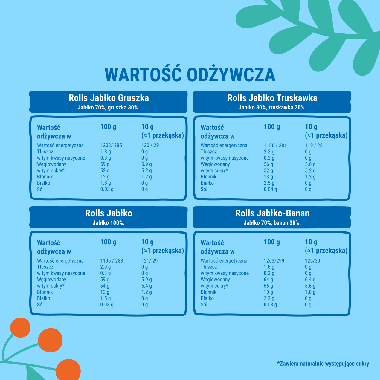 Rollsy owocowe, Paski owocowe, Galaretki owocowe, Żelki owocowe: Przechowywać w suchym miejscu, chronić przed ciepłem. Po otwarciu przekąski spożyć w ciągu 3 dni.