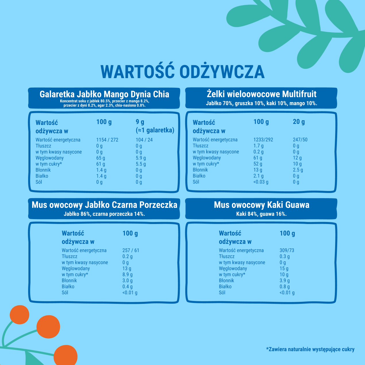 Zawiera substancję słodzącą. Bez dodatku cukrów. Оwoce. Sok i agar. Produkt bezglutenowy. Bez