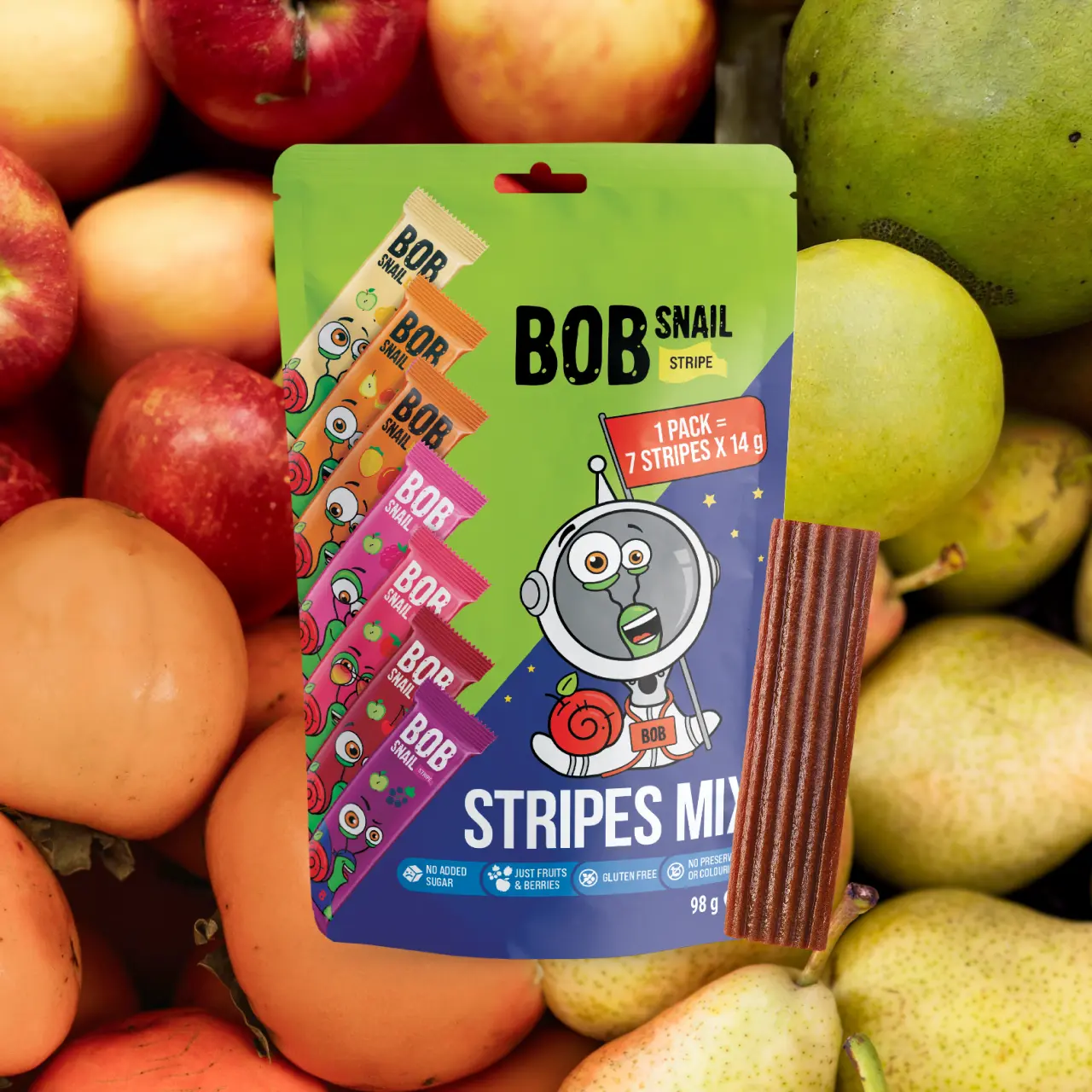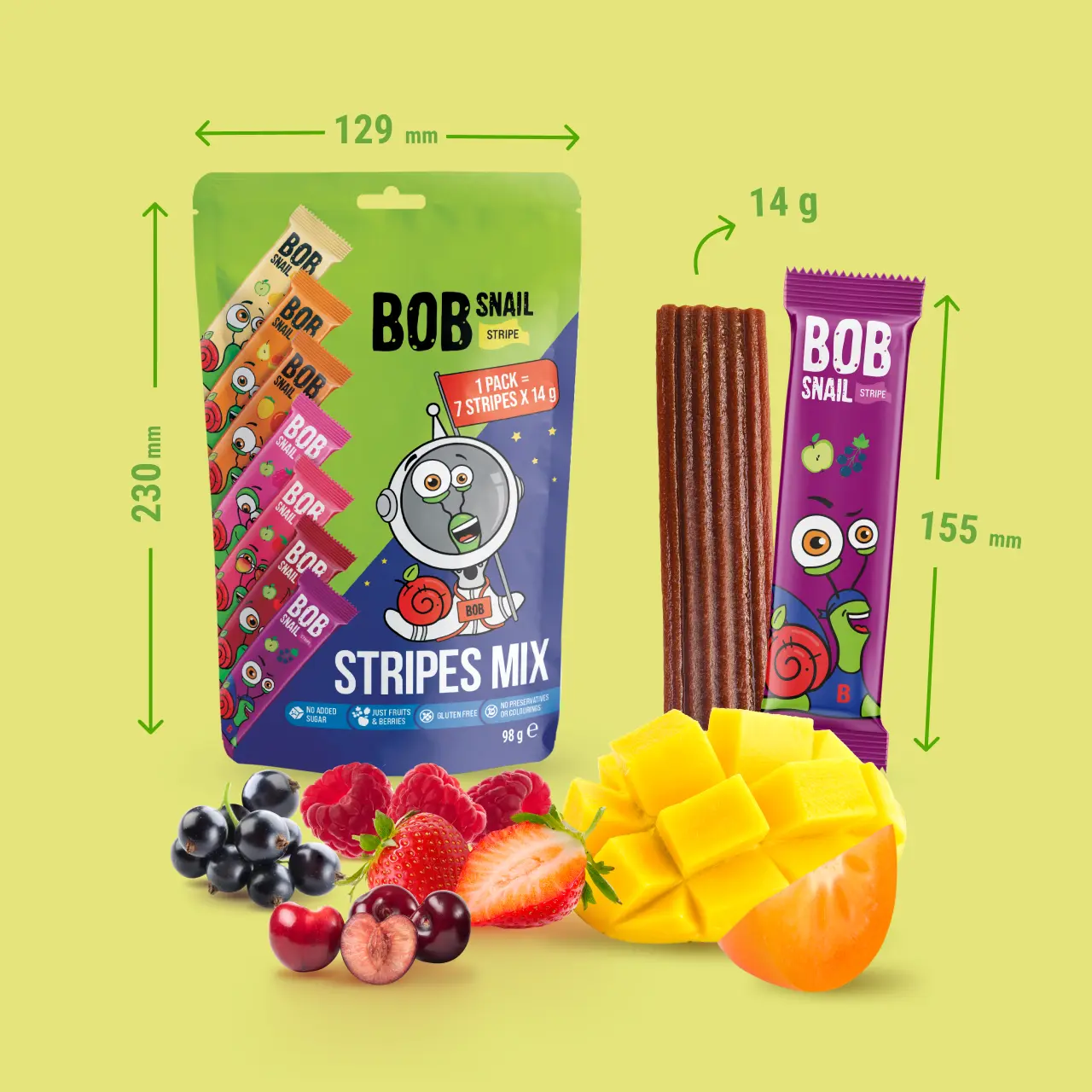 Stripes Mix to zestaw z 7 pasków owocowych. Przekąski powstają wyłącznie z owoców, bez dodatku cukru. Odpowiednie dla wegan. Idealne na szybką przekąskę na każdą okazję.
