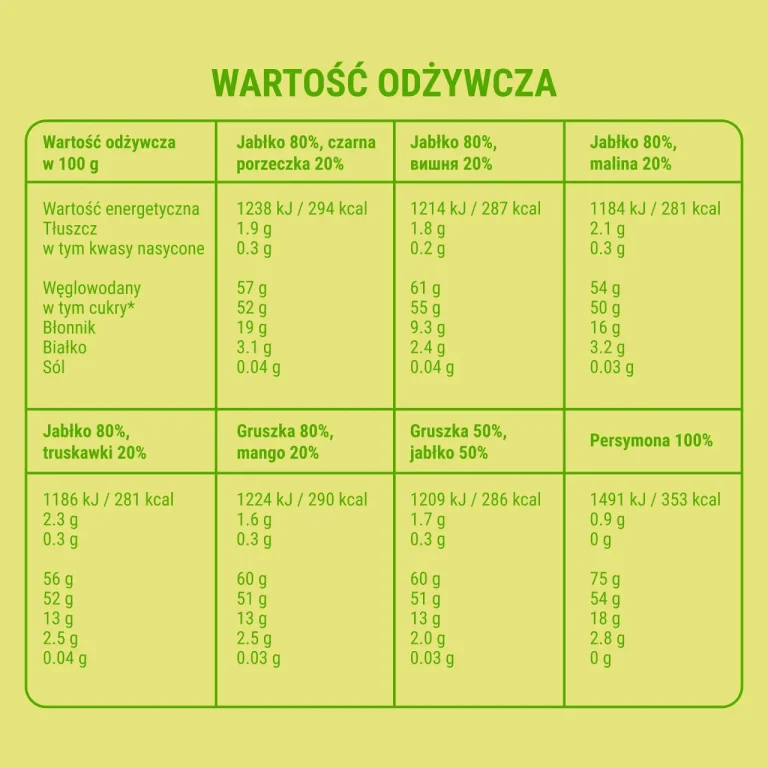 Paski owocowe są wygodne do zabrania ze sobą — zmieszczą się w kieszeni, torbie czy plecaku. Idealne na przekąskę w szkole, w pracy, po treningu lub w podróży. Ulubione smakołyki, które są zawsze pod ręką!