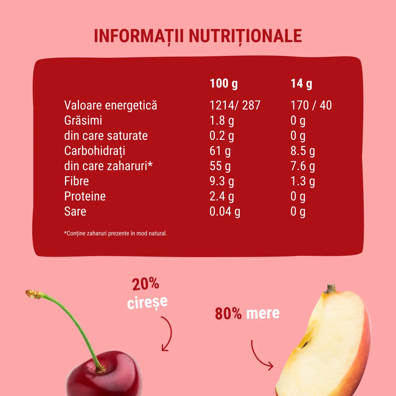 Ingrediente: mere 80%, cireșe 20%.