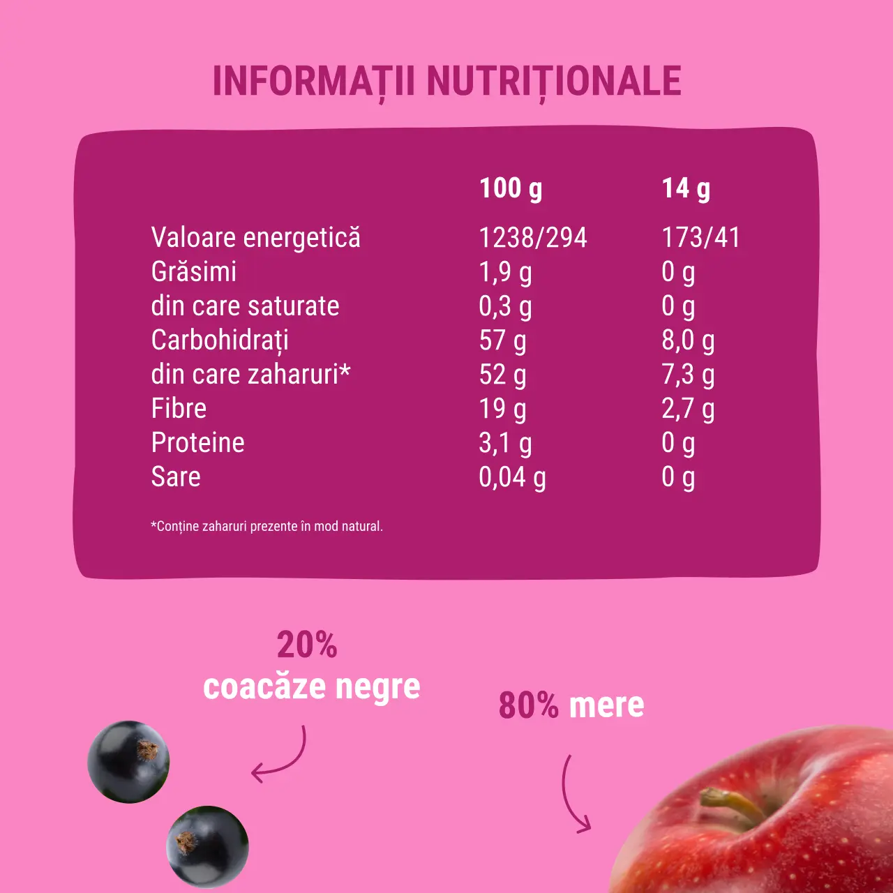 Ingrediente: mere 80%, coacăze negre 20%.