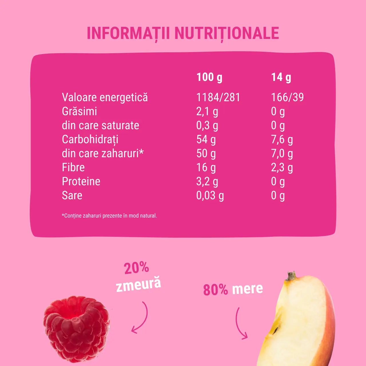 Fâșiile sunt realizate exclusiv din fructe și fructe de pădure, fără zahăr adăugat. Sunt potrivite pentru vegani și ideale pentru gustări rapide, oriunde te-ai afla.