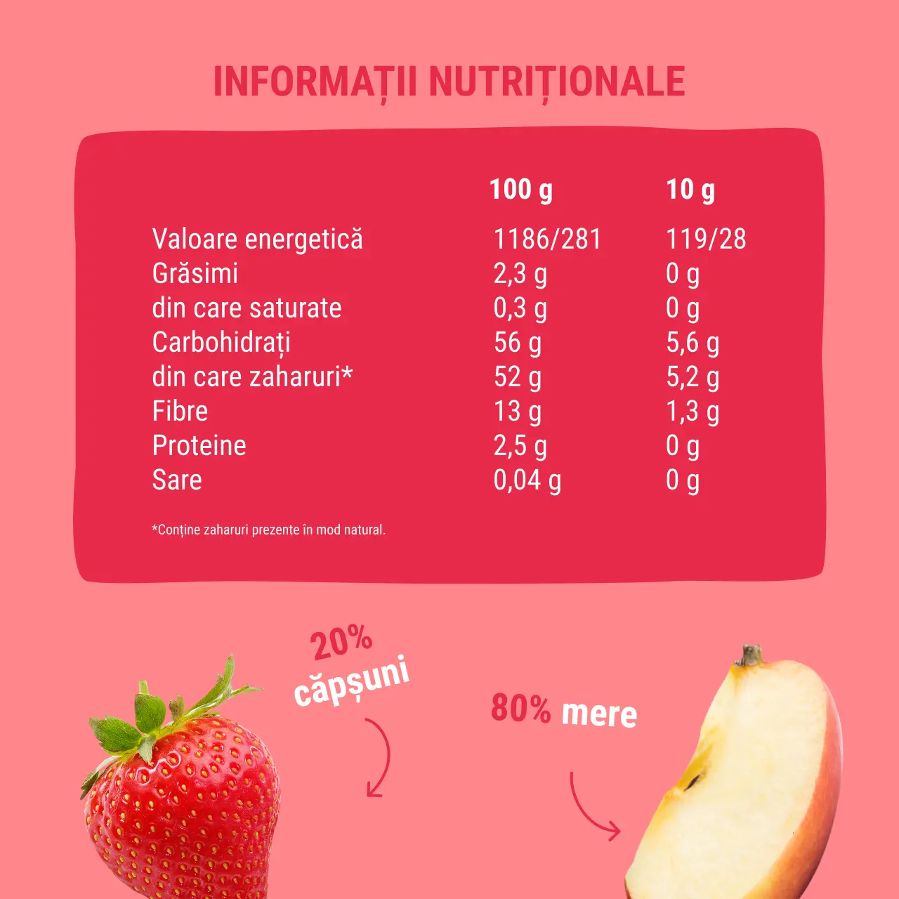 Rulourile din fructe sunt fabricate din fructe și fructe de pădure, fără zahăr adăugat. Nu conțin principalii alergeni: arahide, nuci, lapte, ouă, soia, grâu, pește, moluște și susan. Fără gluten și fără aditivi artificiali. Doar 2–3 ingrediente și nimic în plus!