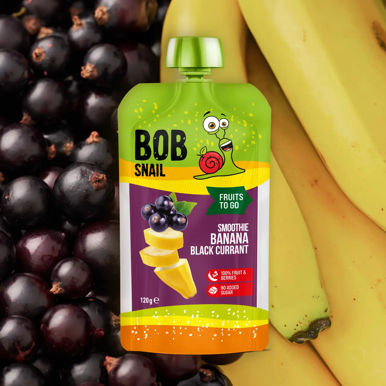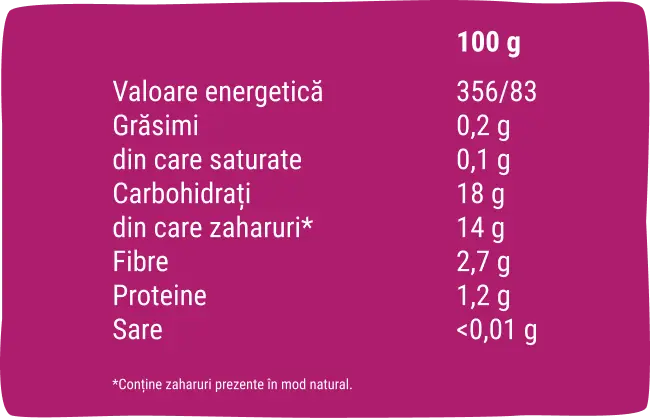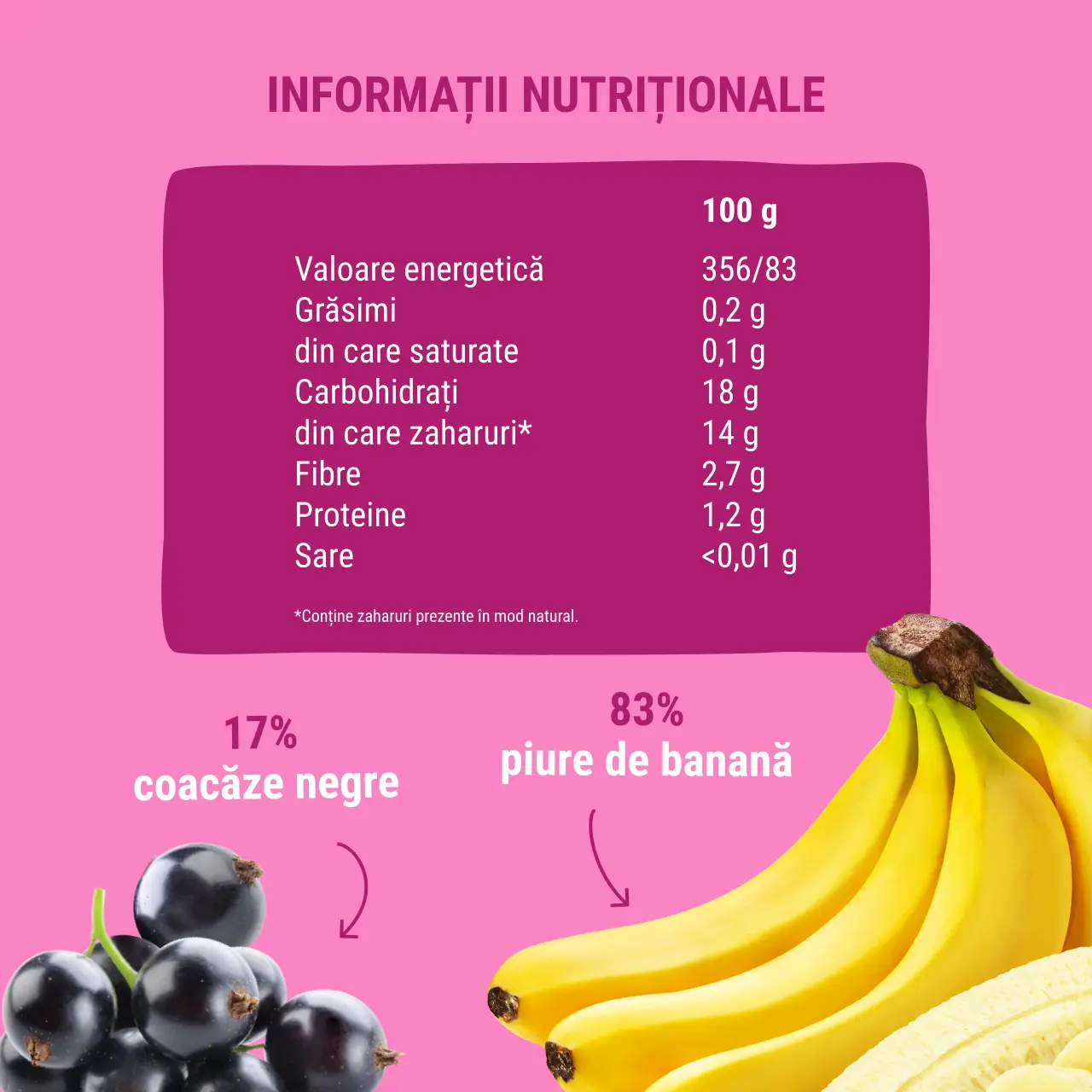 Ingrediente: piure de banană 83%, coacăze negre 17%.