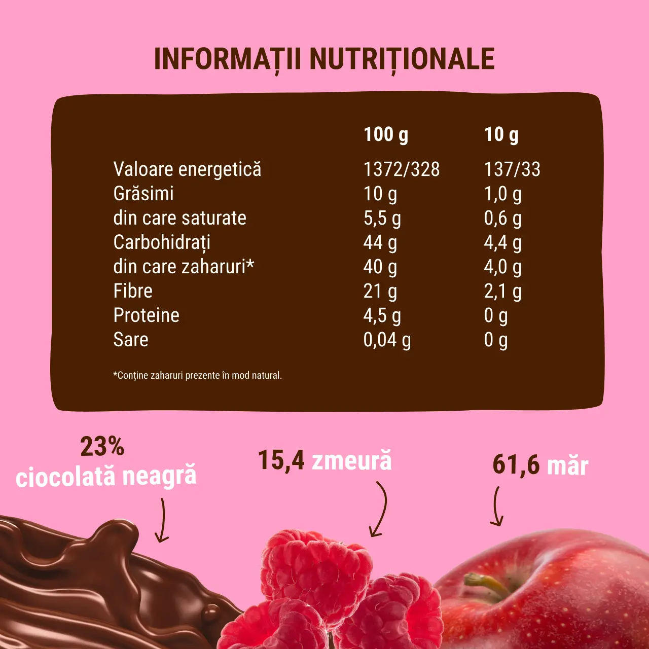 Ingrediente: umplutură de fructe (77%): măr 61,6%, zmeură 15,4%, ciocolată neagră (23%): masă de cacao, fibre alimentare (oligofructoză), cacao cu conținut redus de grăsimie, grăsime din LAPTE , emulsifiant: lecitine din floarea-soarelui, aromă naturală de vanilie, îndulcitor: extract de ștevie.