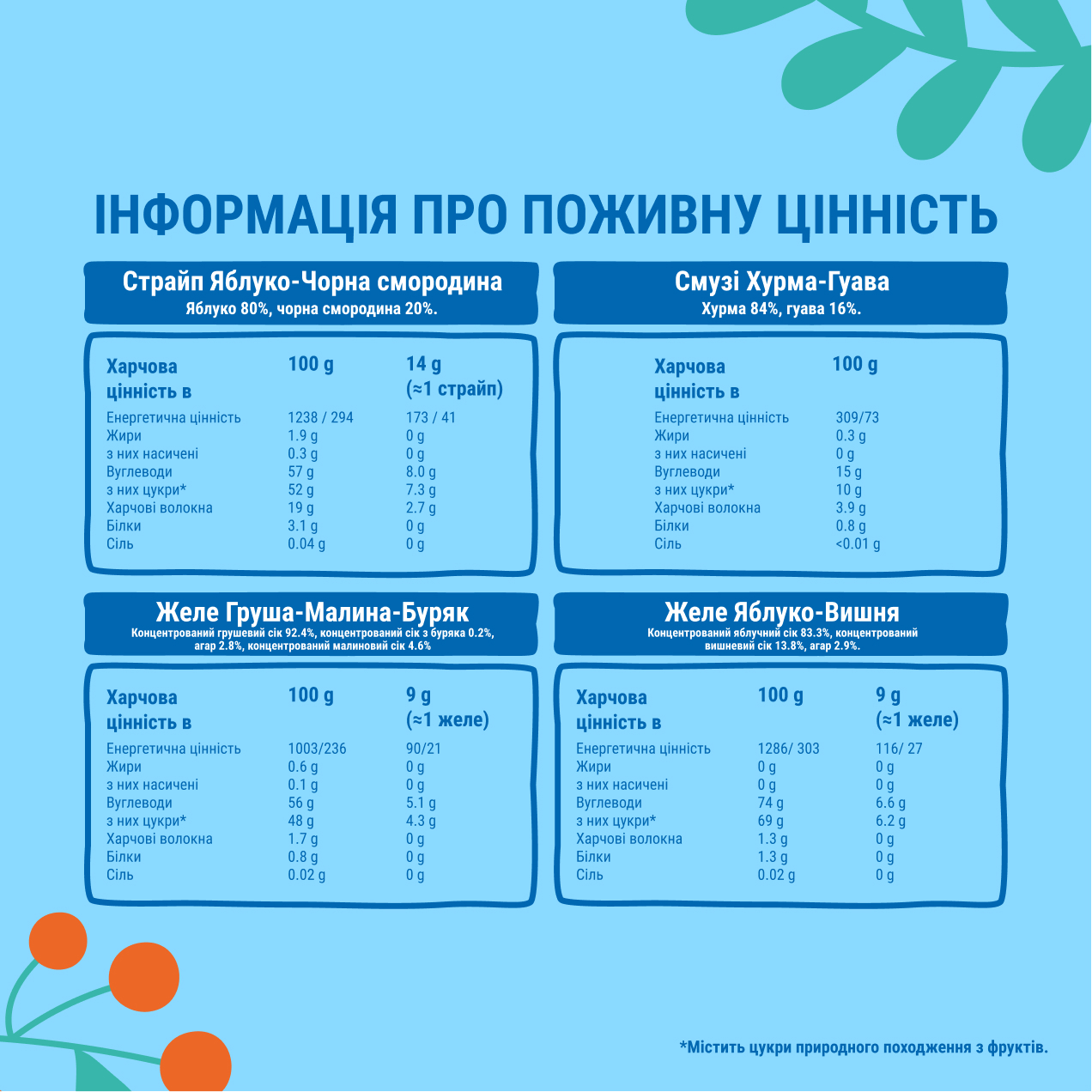 Смаколики виготовлені з фруктів і ягід без доданого цукру. Вони не містять основних алергенів: арахісу, горіхів, молока, яєць, сої, пшениці, риби, молюсків і кунжуту. Без глютену та штучних домішок.