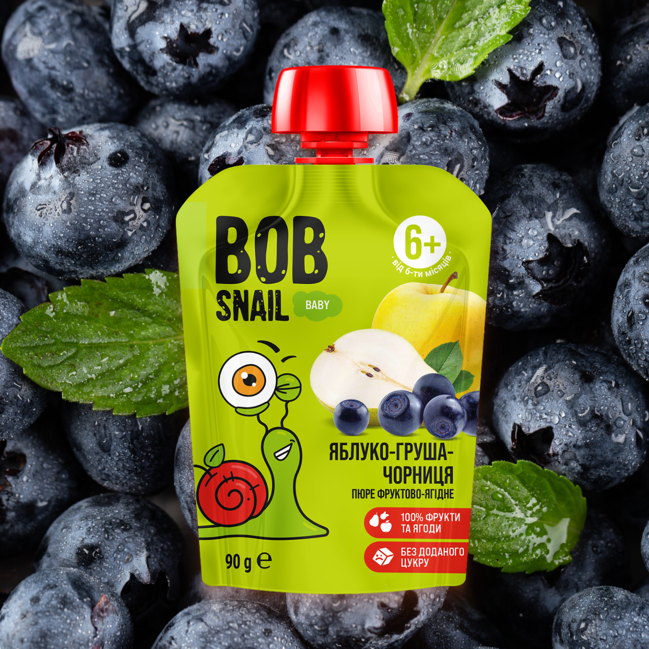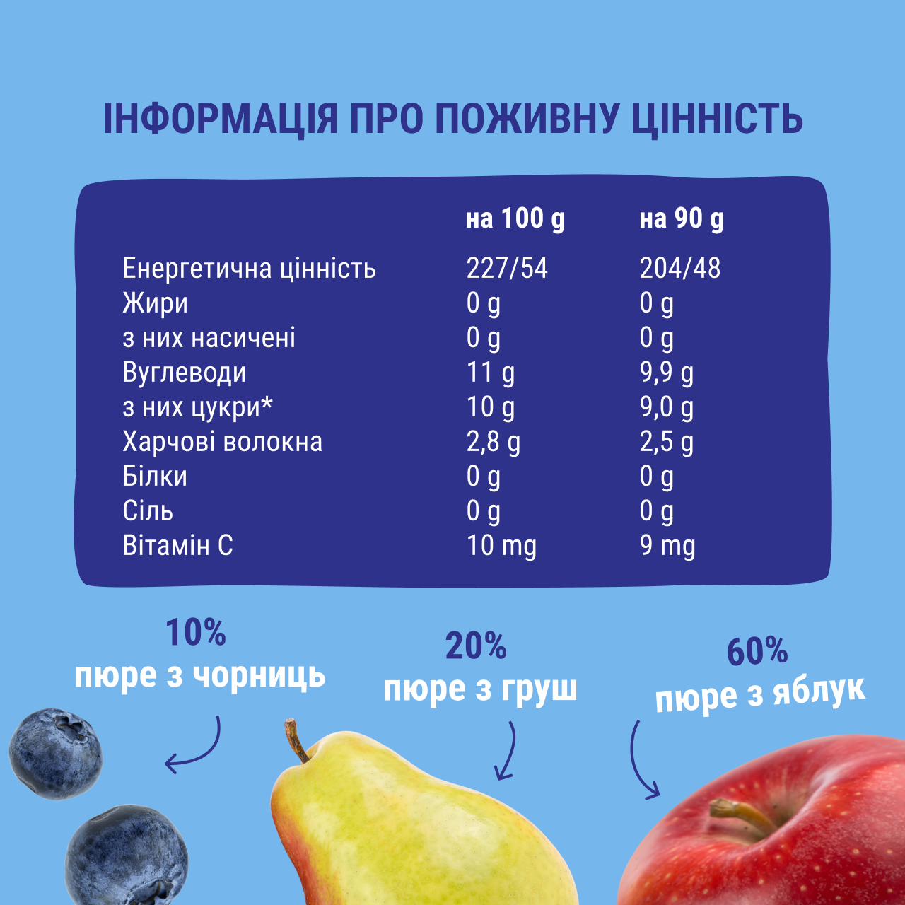 Склад: пюре з яблук 60%, пюре з груш 30%, пюре з чорниць 10%.