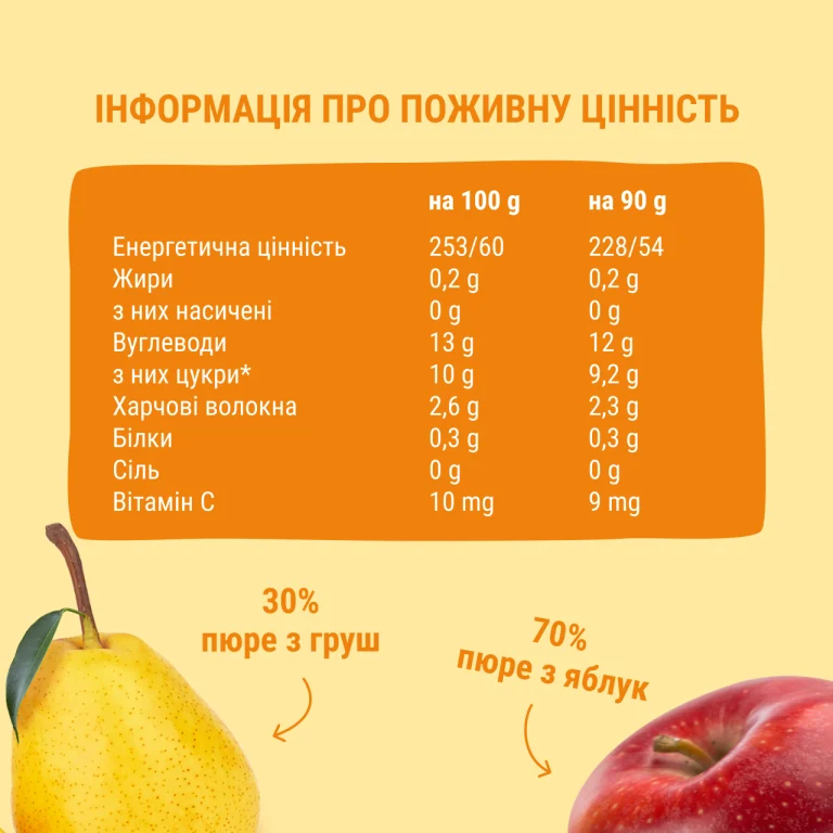 Склад: пюре з яблук 70%, пюре з груш 30%, вітамін С.