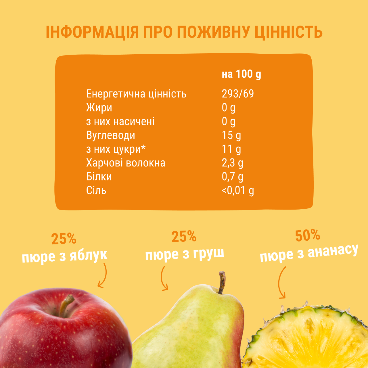 Склад: пюре з ананасу 50%, пюре з груш 25%, пюре з яблук 25%.