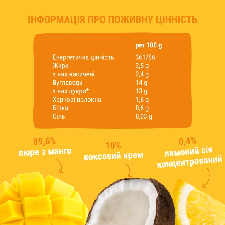 Склад: пюре з манго 89.6%, кокосовий крем 10%, лимонний сік концентрований 0.4%.