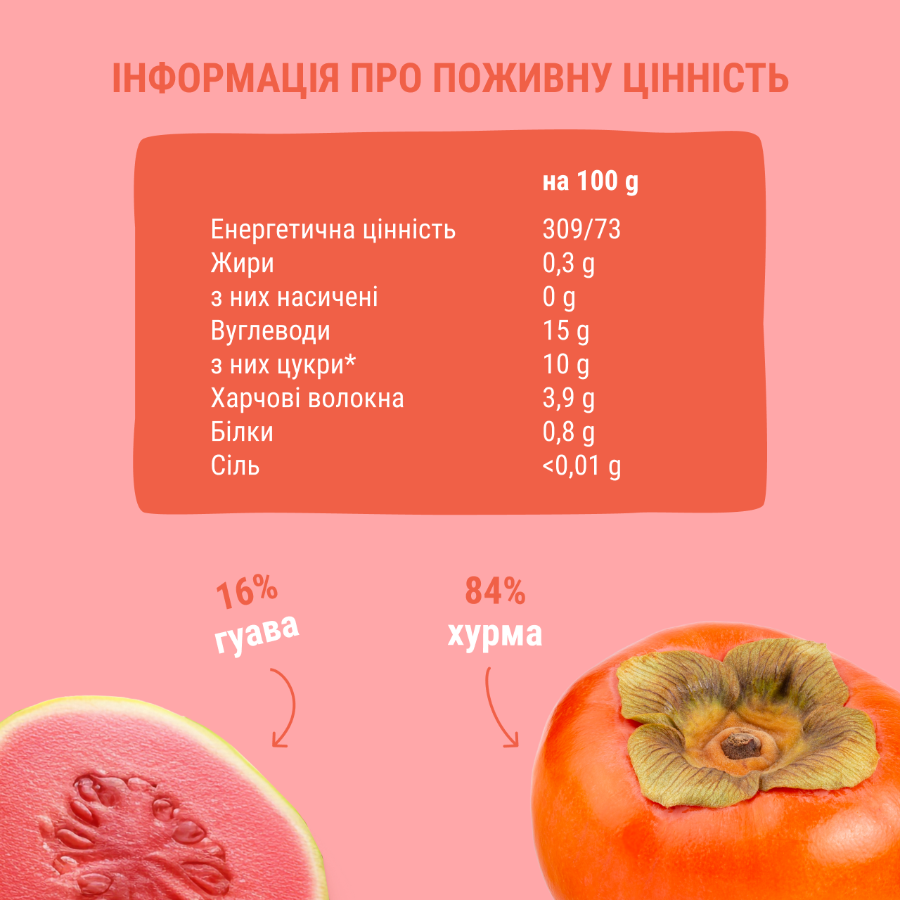 Склад: пюре з хурми 84%, пюре з гуави рожевої 16%.