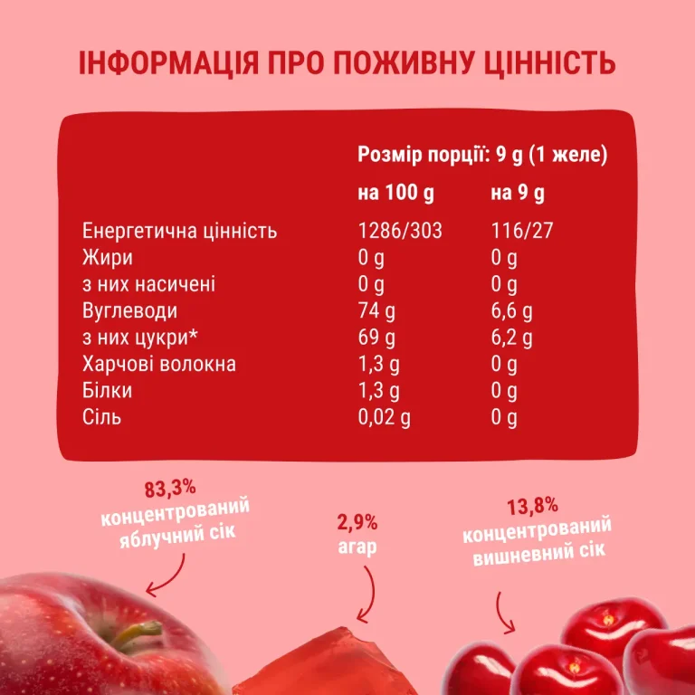 Мармелад із концентрованого фруктового соку — без доданого цукру, желатину чи глютену. Містить природний загусник агар.