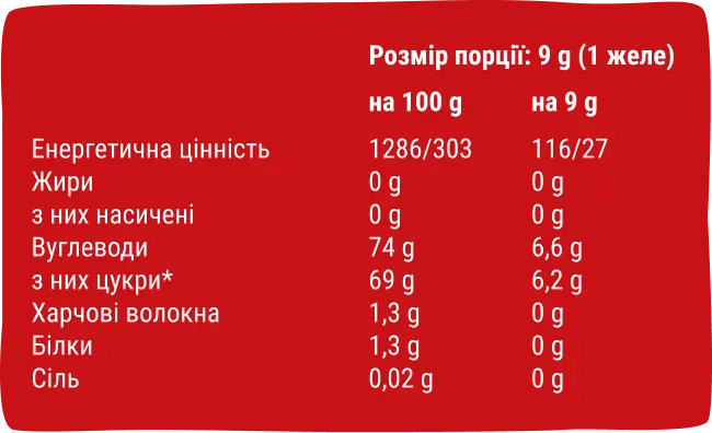 Склад: сік яблучний концентрований 83.3%, сік вишневий концентрований 13.8%, агар 2.9%.