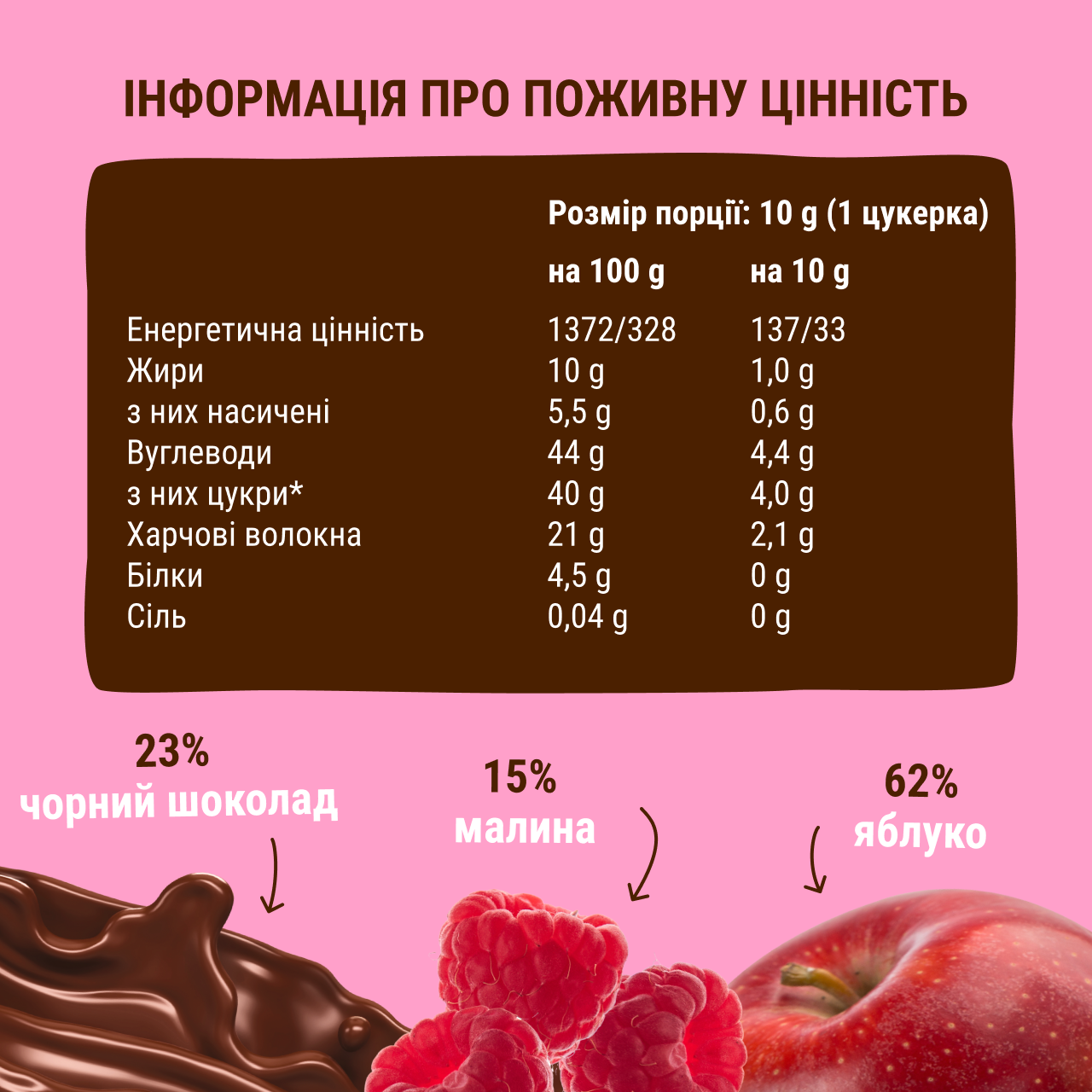 Склад: начинка (77%): яблукa 61.6%, малина 15.4%; чорний шоколад (23%): какао терте, харчові волокна (олігофруктоза), какао-порошок зі зниженим вмістом жиру, МОЛОЧНИЙ жир, cоняшниковий лецитин, натуральний ароматизатор ваніль, підсолоджувач: екстракт стевії.