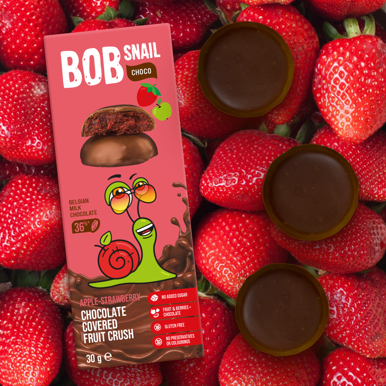 Склад: начинка (77%): яблука 61.6%, полуниця 15.4%; молочний шоколад (23%): харчові волокна (олігофруктоза), какао масло, сухе незбиране МОЛОКО, сухе знежирене МОЛОКО, какао маса, емульгатор: соняшниковий лецитин, натуральний ароматизатор ваніль, підсолоджувач: екстракт стевії.