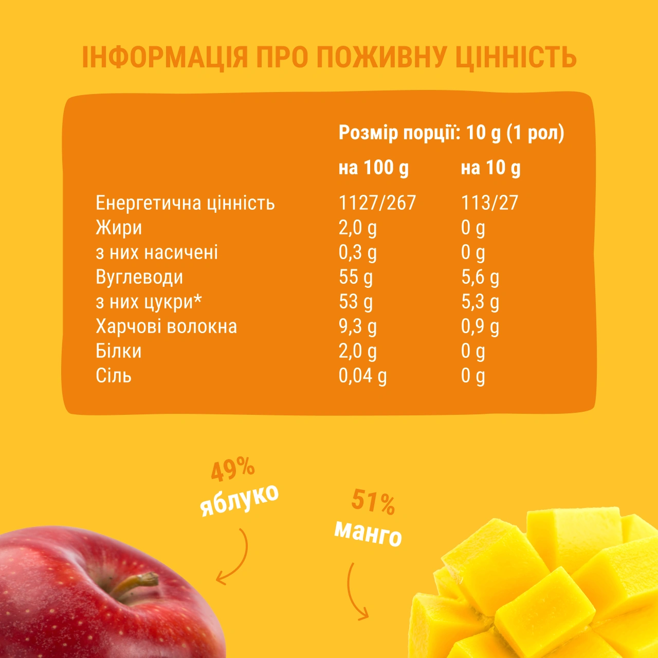 Манго 51%, яблуко 49%.
