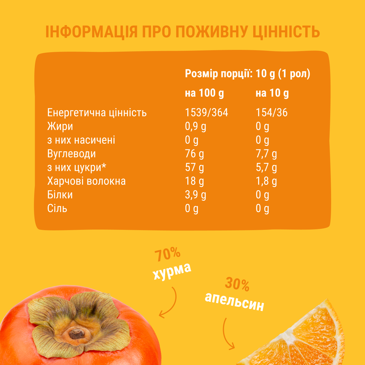 Роли виготовлені з фруктів і ягід без доданого цукру. Вони не містять основних алергенів: арахісу, горіхів, молока, яєць, сої, пшениці, риби, молюсків і кунжуту. Без глютену та штучних домішок. Всього 2-3 інгредієнти і нічого зайвого!