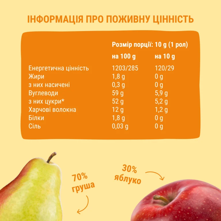 Роли виготовлені з фруктів і ягід без доданого цукру. Вони не містять основних алергенів: арахісу, горіхів, молока, яєць, сої, пшениці, риби, молюсків і кунжуту. Без глютену та штучних домішок. Всього 2-3 інгредієнти і нічого зайвого!
