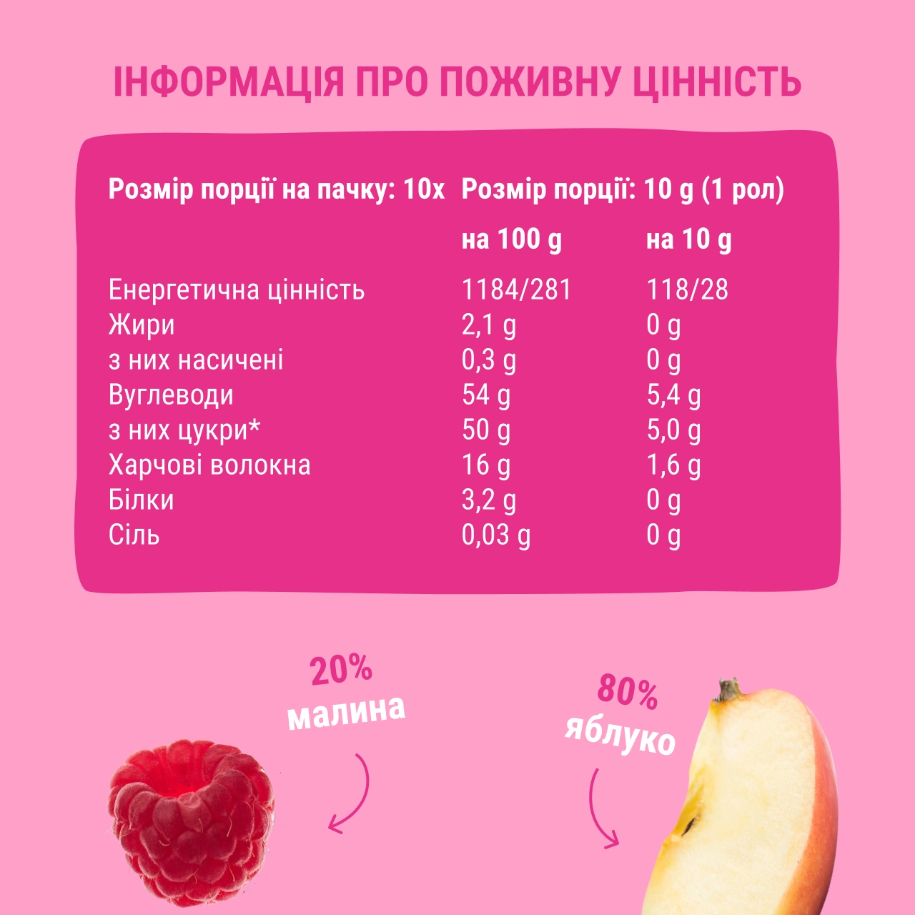 Роли — це снеки зі справжніх фруктів і ягід, без доданого цукру, консервантів, барвників, глютену, ГМО та лактози. Чудовий вибір для дорослих та дітей. Зручний перекус будь-де: у дорозі, в школі чи на роботі.