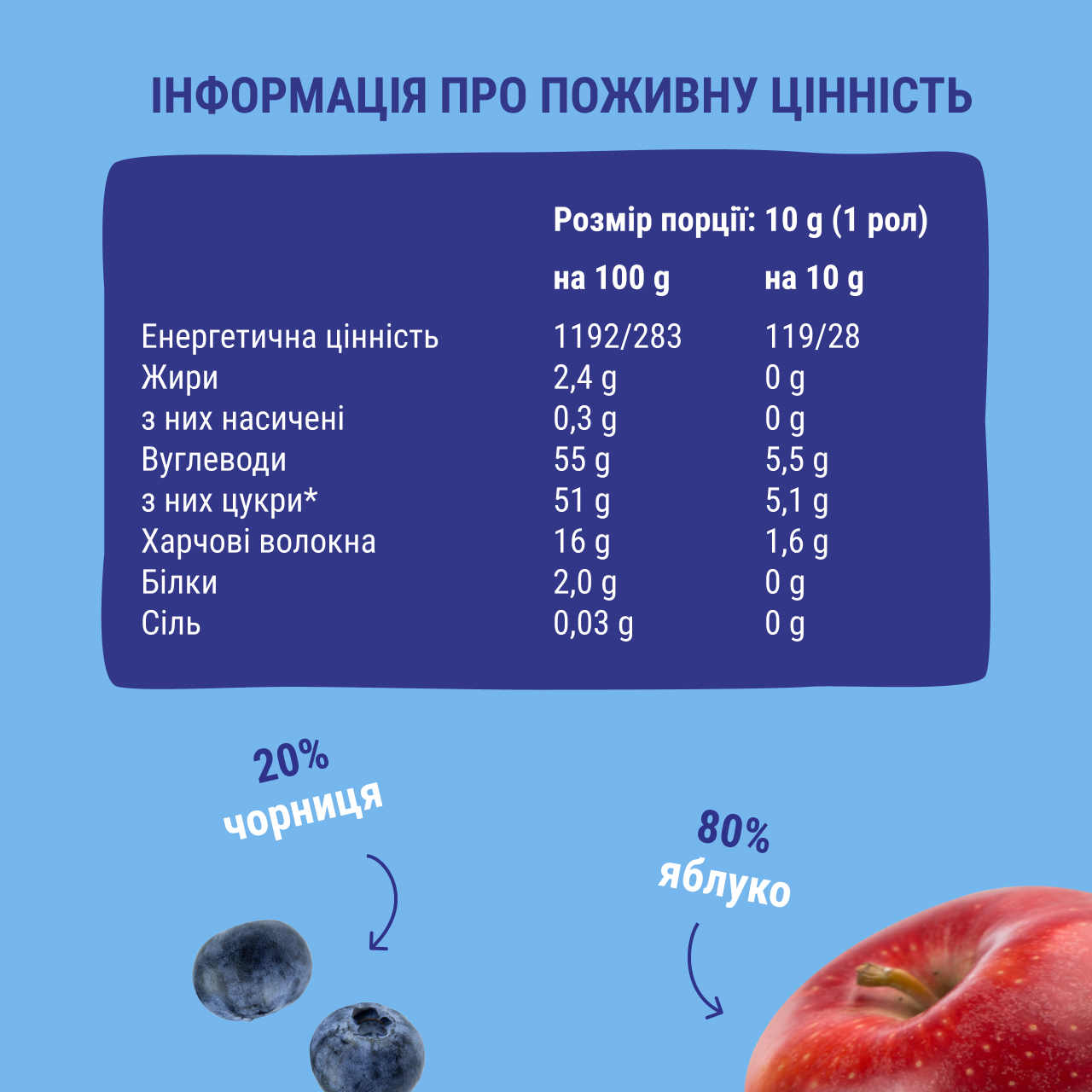 Роли виготовлені з фруктів і ягід без доданого цукру. Вони не містять основних алергенів: арахісу, горіхів, молока, яєць, сої, пшениці, риби, молюсків і кунжуту. Без глютену та штучних домішок. Всього 2-3 інгредієнти і нічого зайвого!