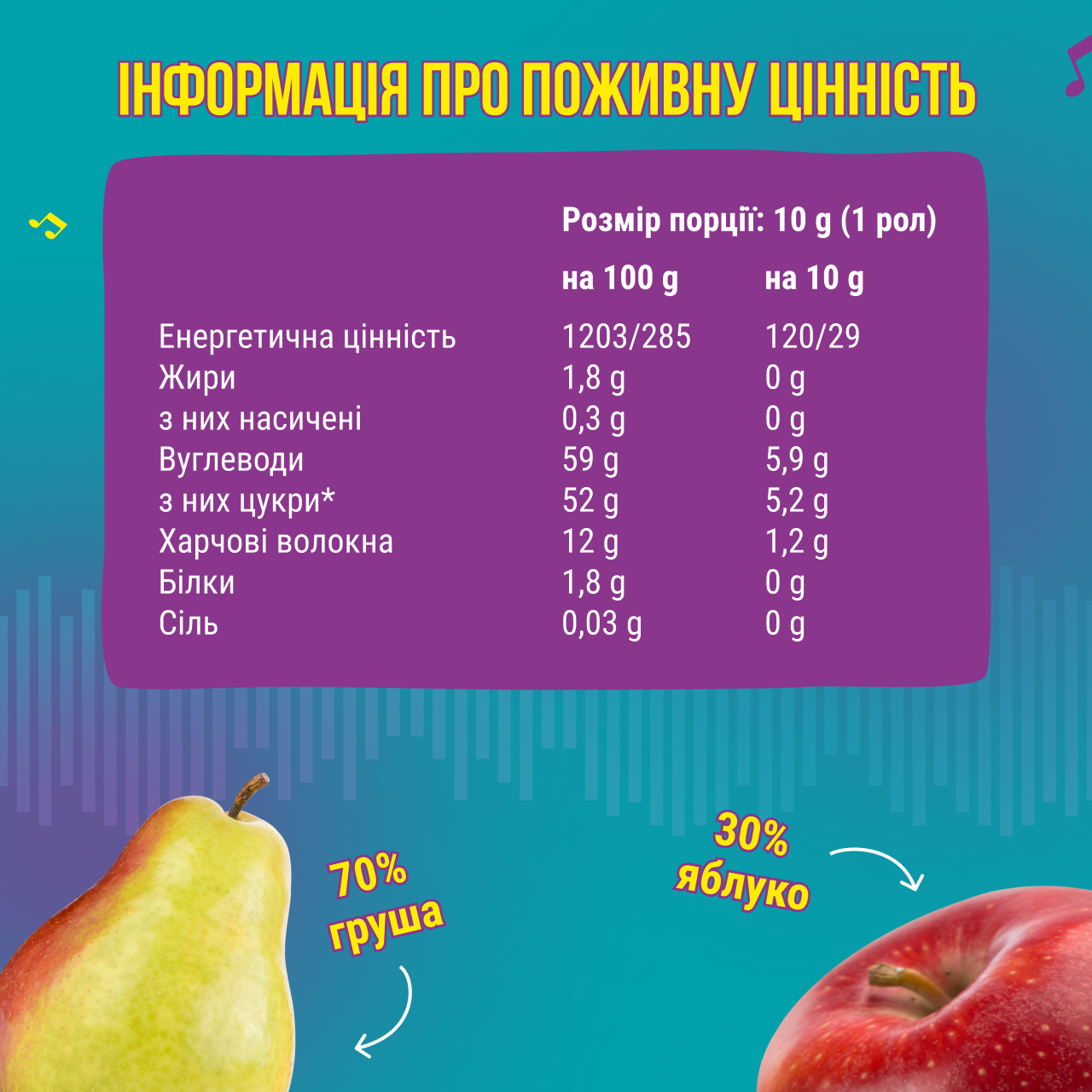 – 2 фруктові роли яблуко-груша без доданого цукру, консервантів, глютену та барвників;