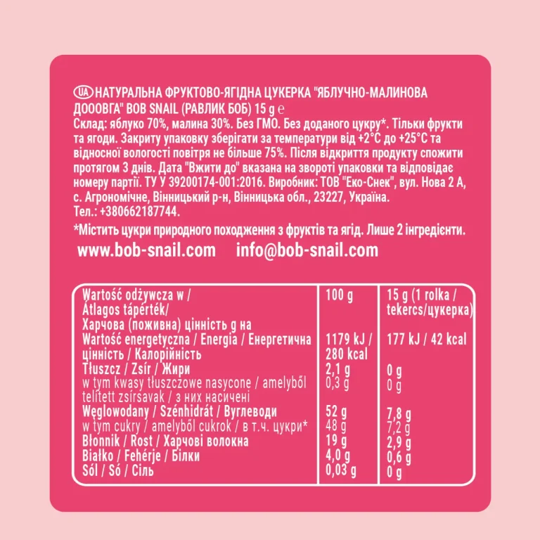Роли виготовлені з фруктів і ягід без доданого цукру. Вони не містять основних алергенів: арахісу, горіхів, молока, яєць, сої, пшениці, риби, молюсків і кунжуту. Без глютену та штучних домішок. Всього 2-3 інгредієнти і нічого зайвого!